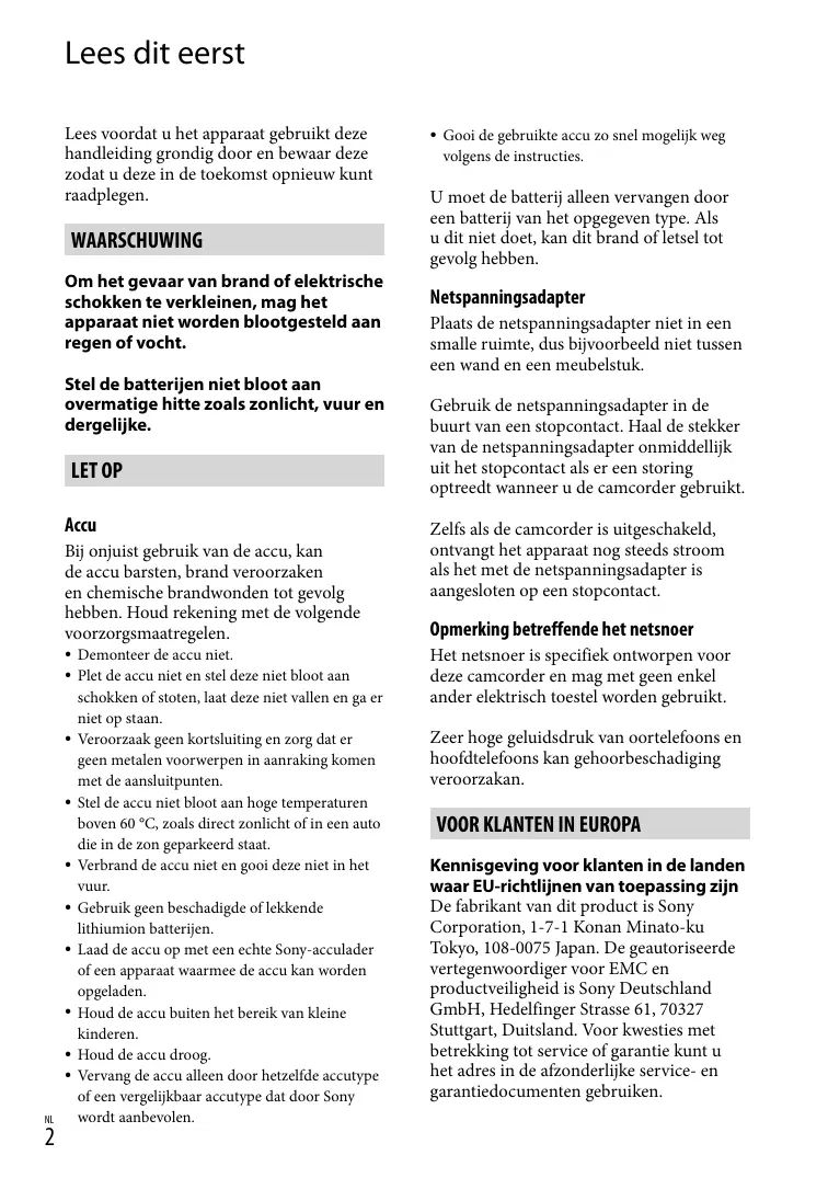 Gooi de gebruikte accu zo snel mogelijk weg volgens de instructies. U moet de batterij alleen vervangen door een batterij van het opgegeven type. Als u dit niet doet, kan dit brand of letsel tot gevolg hebben. Netspanningsadapter Plaats de netspanningsadapter niet in een smalle ruimte, dus bijvoorbeeld niet tussen een wand en een meubelstuk. Gebruik de netspanningsadapter in de buurt van een stopcontact. Haal de stekker van de netspanningsadapter onmiddellijk uit het stopcontact als er een storing optreedt wanneer u de camcorder gebruikt. Zelfs als de camcorder is uitgeschakeld, ontvangt het apparaat nog steeds stroom als het met de netspanningsadapter is aangesloten op een stopcontact. Opmerking betreffende het netsnoer Het netsnoer is specifiek ontworpen voor deze camcorder en mag met geen enkel ander elektrisch toestel worden gebruikt. Zeer hoge geluidsdruk van oortelefoons en hoofdtelefoons kan gehoorbeschadiging veroorzakan.