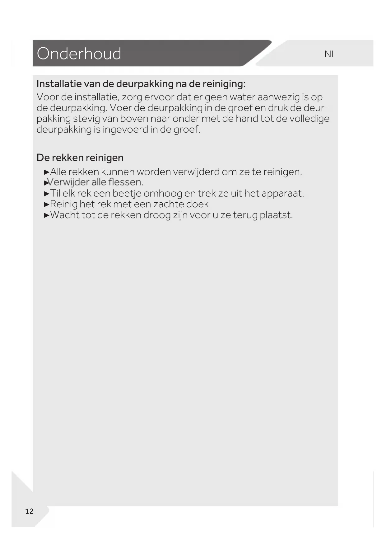 GURRJPHWHHQVFKRQHKDQGGRHN 11NL Onderhoud Installatie van de deurpakking na de reiniging: Voor de installatie, zorg ervoor dat er geen water aanwezig is op de deurpakking. Voer de deurpakking in de groef en druk de deur- pakking stevig van boven naar onder met de hand tot de volledige deurpakking is ingevoerd in de groef. De rekken reinigen ▶ Alle rekken kunnen worden verwijderd om ze te reinigen.