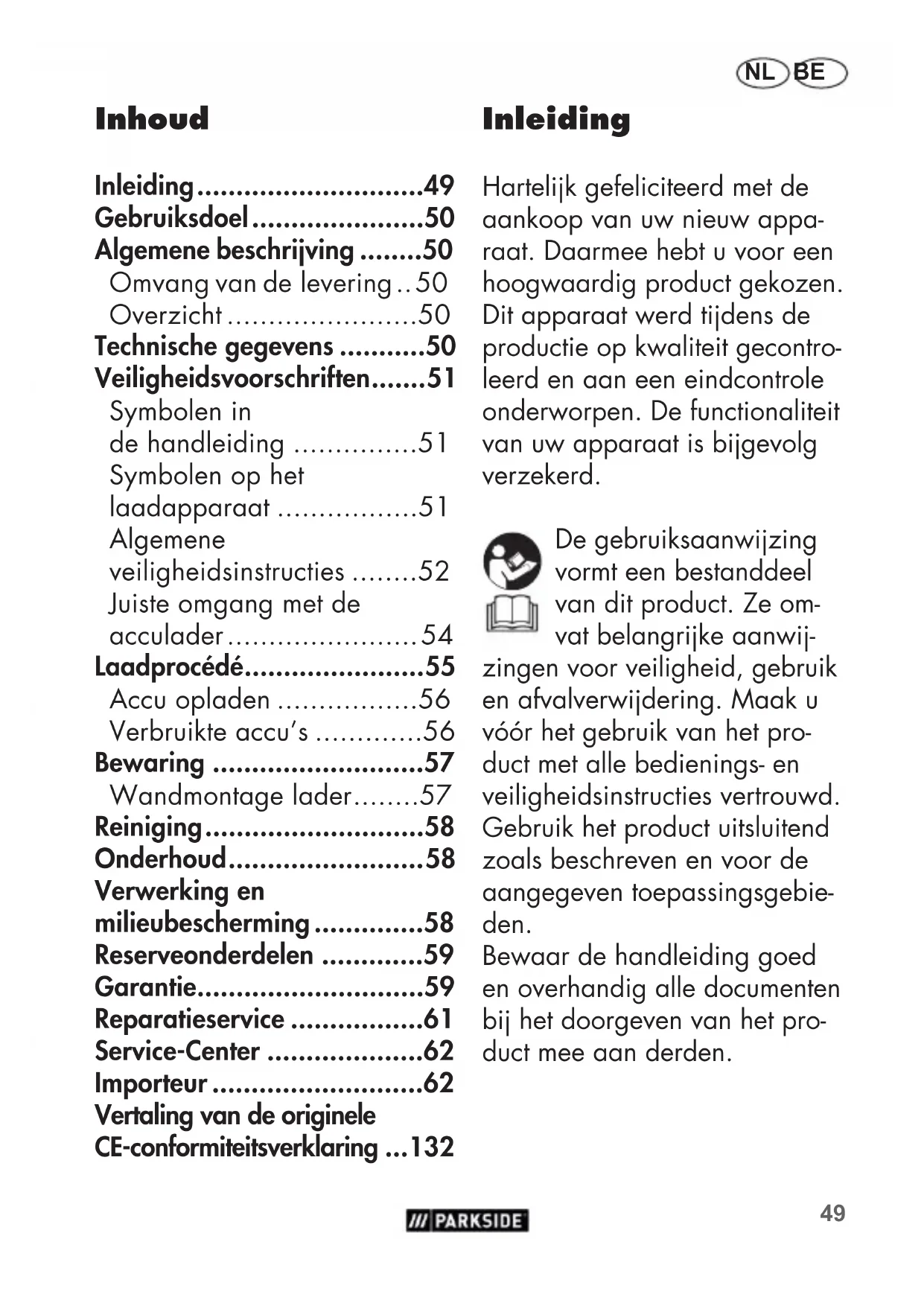 - Open de accu niet en vermijd een mechanische beschadi- ging van de accu. Er bestaat gevaar voor kortslutiting en er kunnen dampen vrijkomen54 NL BE die de luchtwegen prikkelen. Zorg voor verse lucht en consulteer een arts in geval van klachten.