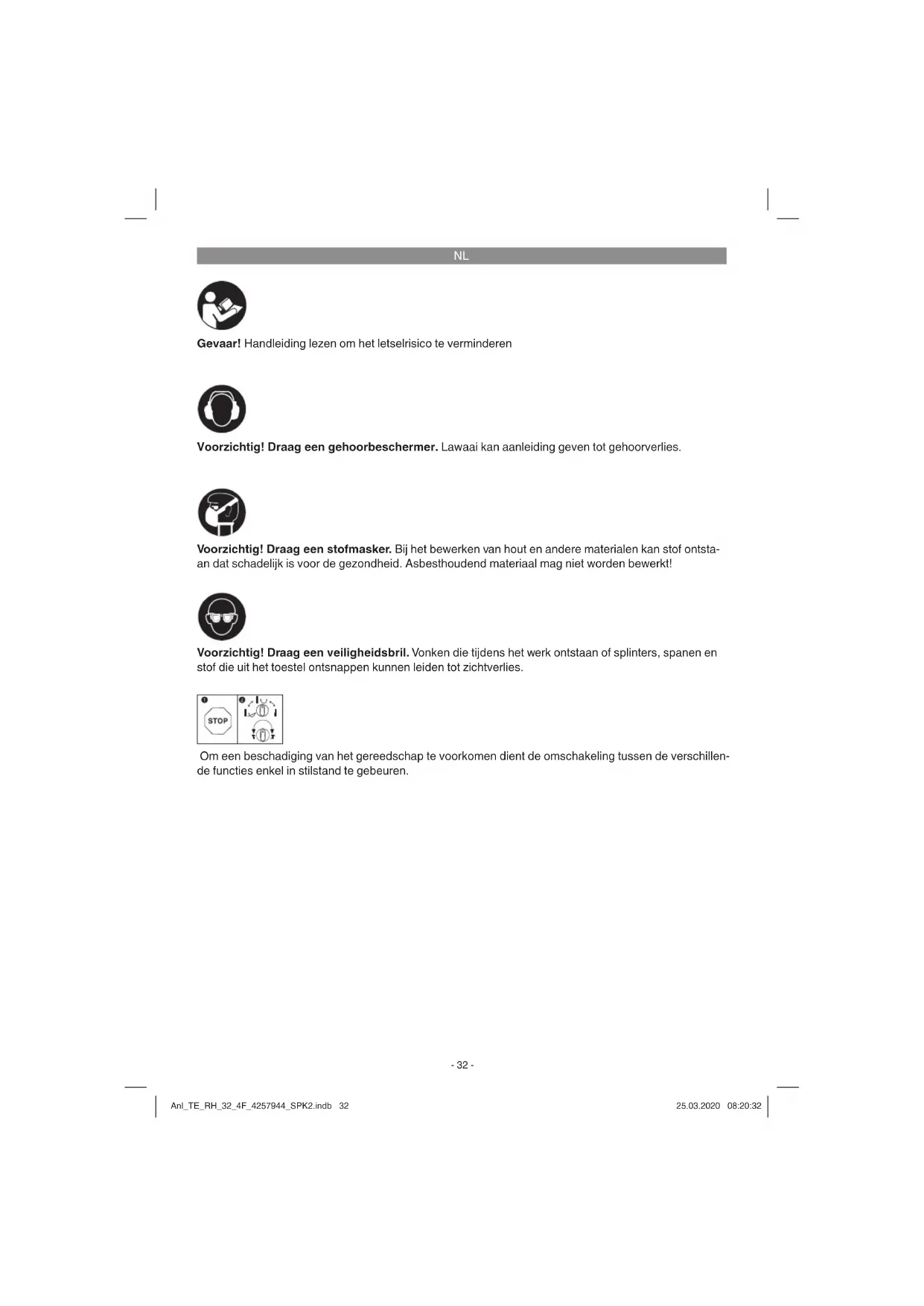 Gevaar! Handleiding lezen om het letselrisico te verminderen Voorzichtig! Draag een gehoorbeschermer. Lawaai kan aanleiding geven tot gehoorverlies. Voorzichtig! Draag een veiligheidsbril. Vonken die tijdens het werk ontstaan of splinters, spanen en stof die uit het toestel ontsnappen kunnen leiden tot zichtverlies. Voorzichtig! Draag een stofmasker. Bij het bewerken van hout en andere materialen kan stof ontsta- an dat schadelijk is voor de gezondheid. Asbesthoudend materiaal mag niet worden bewerkt! Om een beschadiging van het gereedschap te voorkomen dient de omschakeling tussen de verschillen- de functies enkel in stilstand te gebeuren. Anl_TE_RH_32_4F_4257944_SPK2.indb 32Anl_TE_RH_32_4F_4257944_SPK2.indb 32 25.03.2020 08:20:3225.03.2020 08:20:32NL