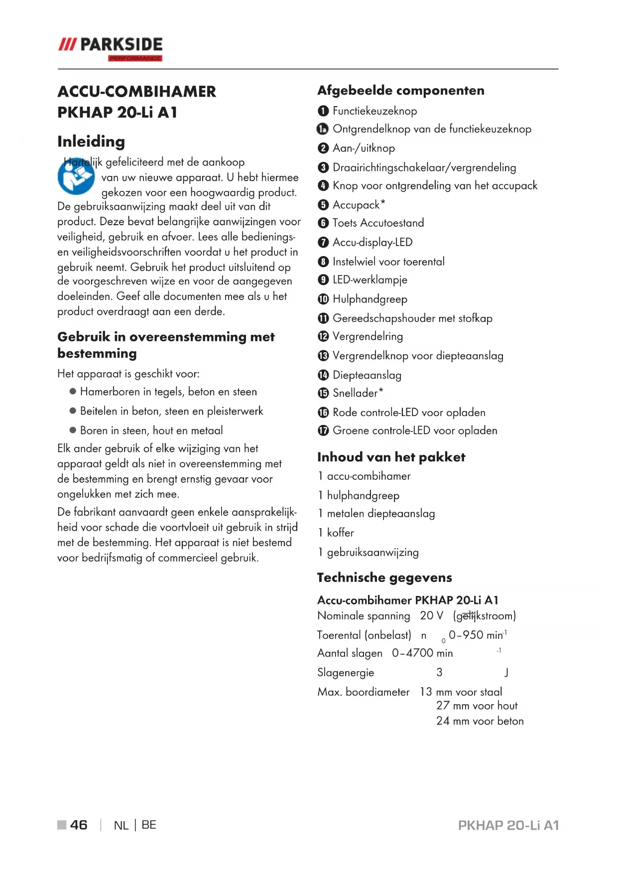 ACCU-COMBIHAMER PKHAP 20-Li A1 Inleiding Hartelijk gefeliciteerd met de aankoop van uw nieuwe apparaat. U hebt hiermee gekozen voor een hoogwaardig product. De gebruiksaanwijzing maakt deel uit van dit product. Deze bevat belangrijke aanwijzingen voor veiligheid, gebruik en afvoer. Lees alle bedienings- en veiligheidsvoorschriften voordat u het product in gebruik neemt. Gebruik het product uitsluitend op de voorgeschreven wijze en voor de aangegeven doeleinden. Geef alle documenten mee als u het product overdraagt aan een derde. Gebruik in overeenstemming met bestemming Het apparaat is geschikt voor: ▯ Hamerboren in tegels, beton en steen ▯ Beitelen in beton, steen en pleisterwerk ▯ Boren in steen, hout en metaal Elk ander gebruik of elke wijziging van het apparaat geldt als niet in overeenstemming met de bestemming en brengt ernstig gevaar voor ongelukken met zich mee. De fabrikant aanvaardt geen enkele aansprakelijk- heid voor schade die voortvloeit uit gebruik in strijd met de bestemming. Het apparaat is niet bestemd voor bedrijfsmatig of commercieel gebruik. Afgebeelde componenten Functiekeuzeknop Ontgrendelknop van de functiekeuzeknop Aan-/uitknop Draairichtingschakelaar/vergrendeling Knop voor ontgrendeling van het accupack Accupack* Toets Accutoestand Accu-display-LED Instelwiel voor toerental LED-werklampje Hulphandgreep - Gereedschapshouder met stofkap 3 Vergrendelring ! Vergrendelknop voor diepteaanslag . Diepteaanslag 0 Snellader* 6 Rode controle-LED voor opladen 1 Groene controle-LED voor opladen Inhoud van het pakket 1 accu-combihamer 1 hulphandgreep 1 metalen diepteaanslag 1 koffer 1 gebruiksaanwijzing Technische gegevens Accu-combihamer PKHAP 20-Li A1 Nominale spanning 20 V (gelijkstroom) Toerental (onbelast) n