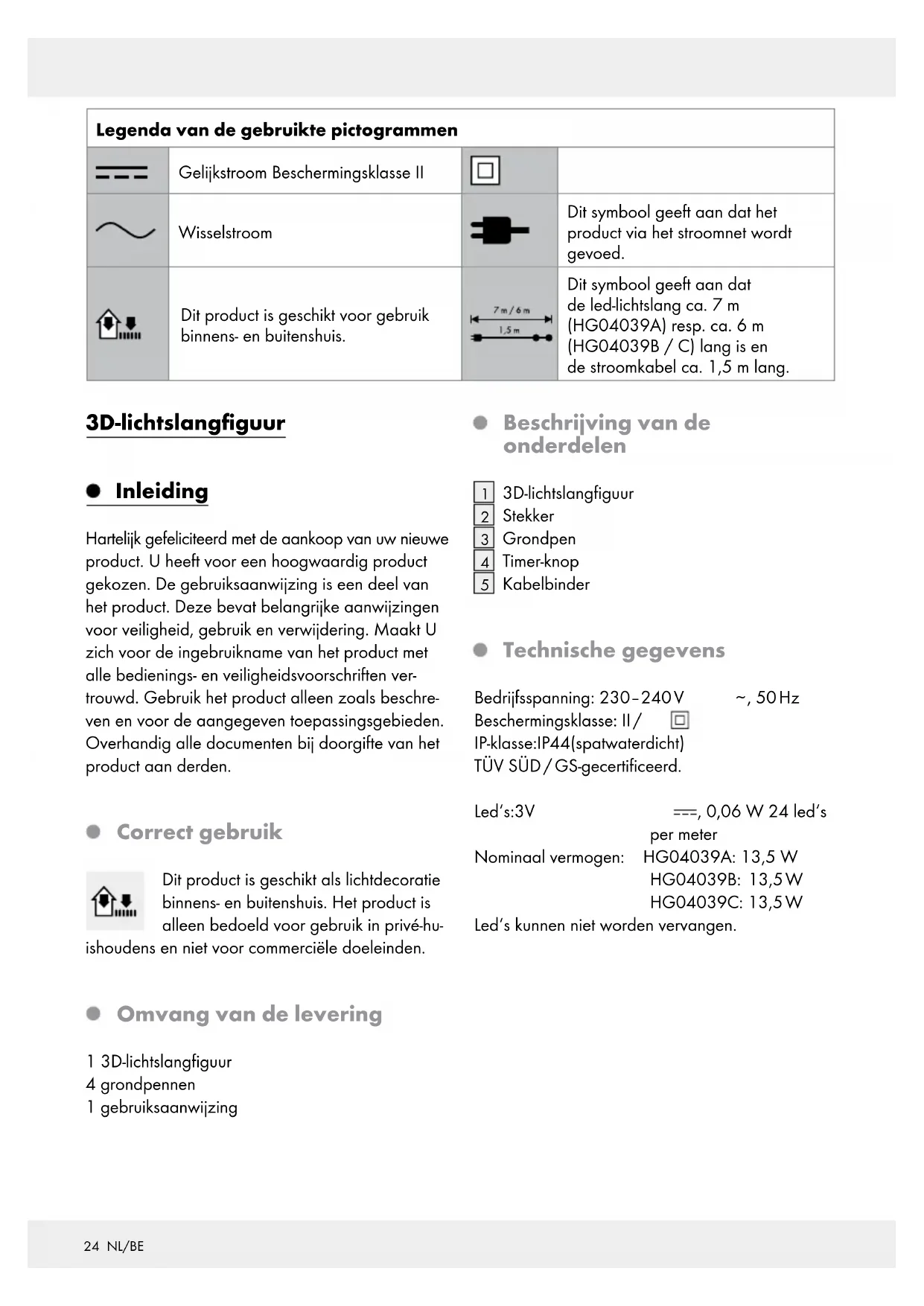 , 50 Hz Beschermingsklasse: II / IP-klasse: IP44 (spatwaterdicht) TÜV SÜD / GS-gecertificeerd. Led‘s: 3 V , 0,06 W 24 led‘s per meter Nominaal vermogen: HG04039A: 13,5 W HG04039B: 13,5 W HG04039C: 13,5 W Led‘s kunnen niet worden vervangen.25 NL/BE Veiligheidsinstructies