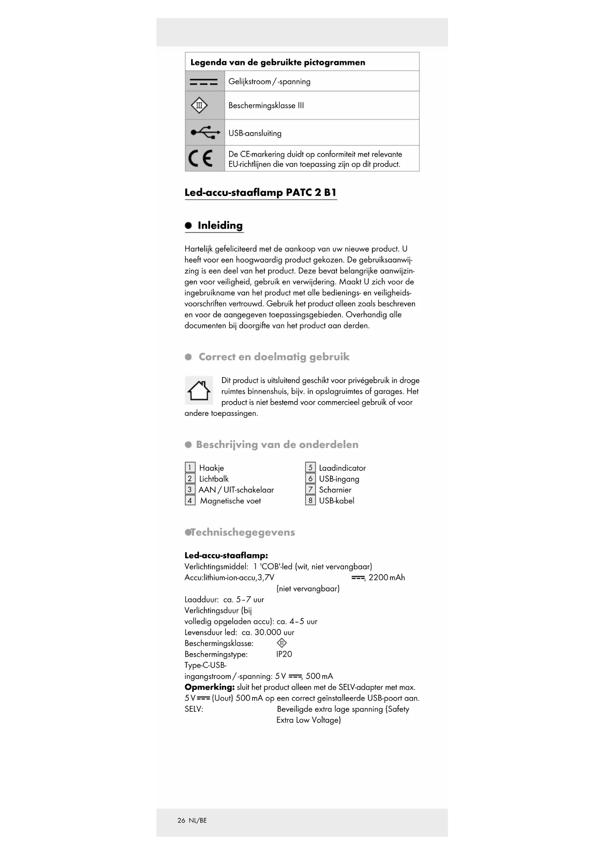 USB-kabel Technische gegevens Led-accu-staaflamp: Verlichtingsmiddel: 1 'COB'-led (wit, niet vervangbaar) Accu: lithium-ion-accu, 3,7 V , 2200 mAh (niet vervangbaar) Laadduur: ca. 5–7 uur Verlichtingsduur (bij volledig opgeladen accu): ca. 4–5 uur Levensduur led: ca. 30.000 uur Beschermingsklasse: Beschermingstype: IP20 Type-C-USB- ingangstroom / -spanning: 5 V , 500 mA Opmerking: sluit het product alleen met de SELV-adapter met max. 5 V (Uout) 500 mA op een correct geïnstalleerde USB-poort aan. SELV: Beveiligde extra lage spanning (Safety Extra Low Voltage)27 NL/BE Omvang van de levering 1 led-accu-staaflamp 1 USB-kabel 1 gebruiksaanwijzing Veiligheidsinstructies Maak u voor het eerste gebruik van het product vertrouwd met alle bedienings- en veiligheidsvoorschriften! Geef ook alle documenten mee wanneer u het product aan derden geeft! LEVENSGEVAAR EN