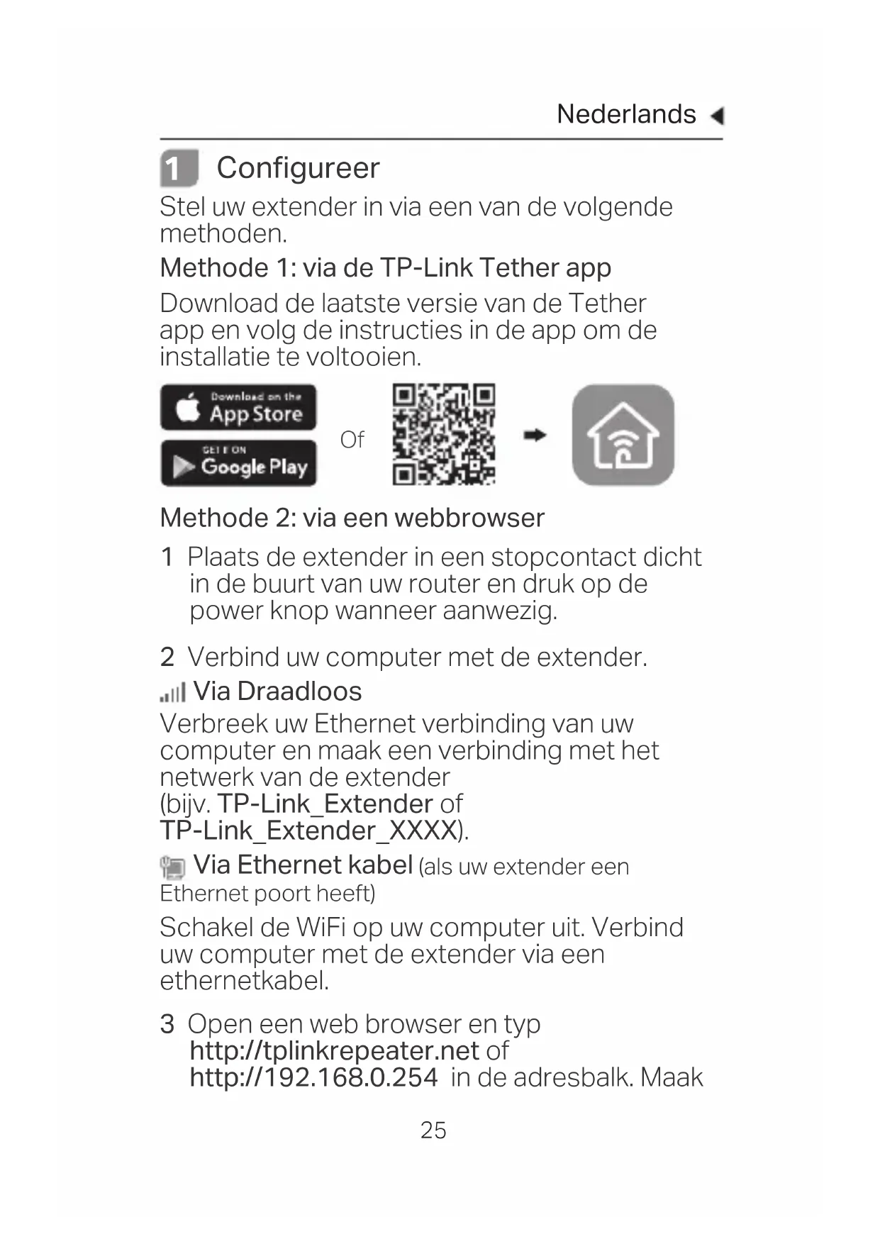 Configureer Stel uw extender in via een van de volgende methoden. Methode 1: via de TP-Link Tether app Download de laatste versie van de Tether app en volg de instructies in de app om de installatie te voltooien. Methode 2: via een webbrowser 1 Plaats de extender in een stopcontact dicht in de buurt van uw router en druk op de power knop wanneer aanwezig. 2 Verbind uw computer met de extender. Via Draadloos Verbreek uw Ethernet verbinding van uw computer en maak een verbinding met het netwerk van de extender (bijv. TP-Link_Extender of TP-Link_Extender_XXXX). Via Ethernet kabel (als uw extender een Ethernet poort heeft) Schakel de WiFi op uw computer uit. Verbind uw computer met de extender via een ethernetkabel. 3 Open een web browser en typ http://tplinkrepeater.net of http://192.168.0.254 in de adresbalk. Maak OfNederlands