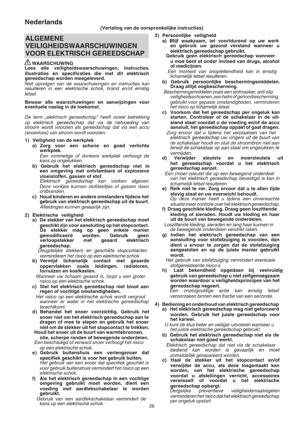 Bediening en onderhoud van elektrisch gereedschap a) Het elektrisch gereedschap mag niet geforceerd worden. Gebruik het juiste gereedschap voor het karwei. U kunt de klus beter en veiliger uitvoeren wanneer u het juiste elektrische gereedschap gebruikt. b) Gebruik het elektrisch gereedschap niet als de schakelaar niet goed werkt. Elektrisch gereedschap dat niet via de schakelaar bediend kan worden is gevaarlijk en moet onmiddellijk gerepareerd worden. c) Haal de stekker uit het stopcontact en/of verwijder de accu, als deze losgemaakt kan worden, van het elektrische gereedschap voordat u afstellingen verricht, accessoires verwisselt of voordat u het elektrische gereedschap opbergt. Dergelijke preventieve veiligheidsmaatregelen verminderen het risico dat het elektrisch gereedschap per ongeluk opstart. ALGEMENE VEILIGHEIDSWAARSCHUWINGEN