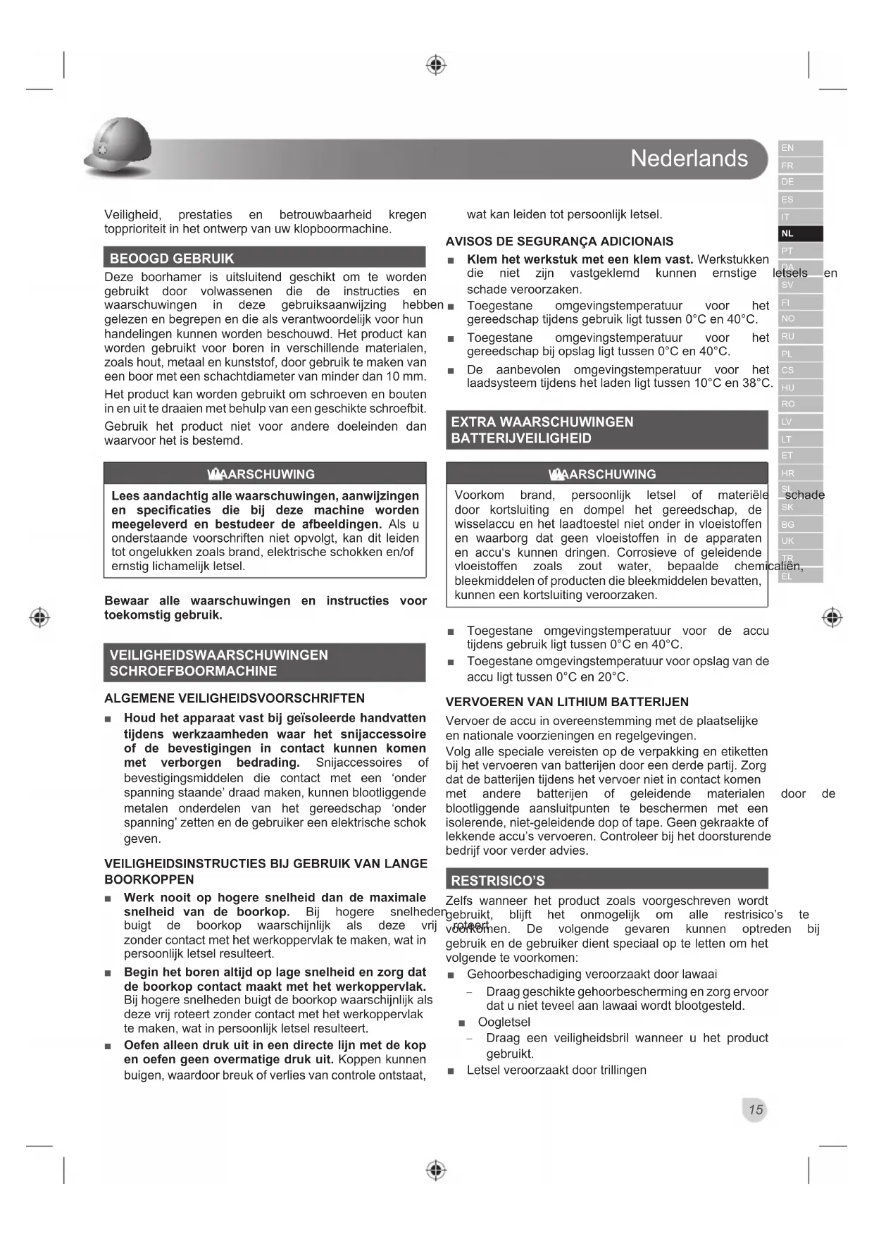 Veiligheid, prestaties en betrouwbaarheid kregen topprioriteit in het ontwerp van uw klopboormachine. BEOOGD GEBRUIK Deze boorhamer is uitsluitend geschikt om te worden gebruikt door volwassenen die de instructies en ZDDUVFKXZLQJHQ LQ GH]H JHEUXLNVDDQZLM]LQJ KHEEHQ JHOH]HQHQEHJUHSHQHQGLHDOVYHUDQWZRRUGHOLMNYRRUKXQ handelingen kunnen worden beschouwd. Het product kan worden gebruikt voor boren in verschillende materialen, zoals hout, metaal en kunststof, door gebruik te maken van een boor met een schachtdiameter van minder dan 10 mm. Het product kan worden gebruikt om schroeven en bouten in en uit te draaien met behulp van een geschikte schroefbit. Gebruik het product niet voor andere doeleinden dan waarvoor het is bestemd. WAARSCHUWING Lees aandachtig alle waarschuwingen, aanwijzingen en specificaties die bij deze machine worden meegeleverd en bestudeer de afbeeldingen. Als u onderstaande voorschriften niet opvolgt, kan dit leiden WRWRQJHOXNNHQ]RDOVEUDQGHOHNWULVFKHVFKRNNHQHQRI HUQVWLJOLFKDPHOLMNOHWVHO Bewaar alle waarschuwingen en instructies voor toekomstig gebruik. VEILIGHEIDSWAARSCHUWINGEN SCHROEFBOORMACHINE ALGEMENE VEILIGHEIDSVOORSCHRIFTEN Ŷ Houd het apparaat vast bij geïsoleerde handvatten tijdens werkzaamheden waar het snijaccessoire of de bevestigingen in contact kunnen komen met verborgen bedrading. 6QLMDFFHVVRLUHV RI bevestigingsmiddelen die contact met een ‘onder spanning staande’ draad maken, kunnen blootliggende metalen onderdelen van het gereedschap ‘onder spanning’ zetten en de gebruiker een elektrische schok geven.