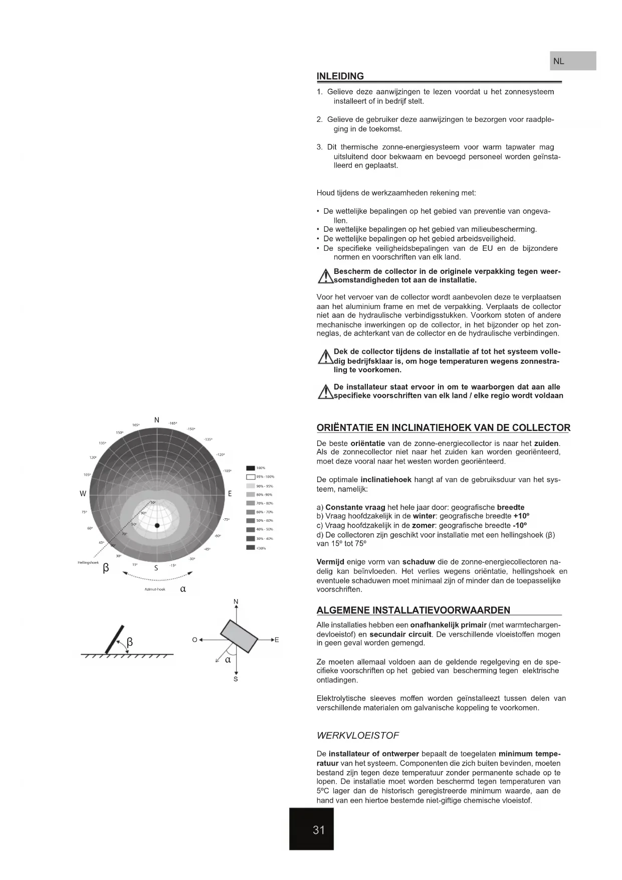 - De specieke veiligheidsbepalingen van de EU en de bijzondere normen en voorschriften van elk land. Bescherm de collector in de originele verpakking tegen weer- somstandigheden tot aan de installatie. Dek de collector tijdens de installatie af tot het systeem volle- dig bedrijfsklaar is, om hoge temperaturen wegens zonnestra- ling te voorkomen. De installateur staat ervoor in om te waarborgen dat aan alle specieke voorschriften van elk land / elke regio wordt voldaan Voor het vervoer van de collector wordt aanbevolen deze te verplaatsen aan het aluminium frame en met de verpakking. Verplaats de collector niet aan de hydraulische verbindigsstukken. Voorkom stoten of andere mechanische inwerkingen op de collector, in het bijzonder op het zon- neglas, de achterkant van de collector en de hydraulische verbindingen. De beste oriëntatie van de zonne-energiecollector is naar het zuiden. Als de zonnecollector niet naar het zuiden kan worden georiënteerd, moet deze vooral naar het westen worden georiënteerd. De optimale inclinatiehoek hangt af van de gebruiksduur van het sys- teem, namelijk: a) Constante vraag het hele jaar door: geograsche breedte b) Vraag hoofdzakelijk in de winter: geograsche breedte +10º c) Vraag hoofdzakelijk in de zomer: geograsche breedte -10º d) De collectoren zijn geschikt voor installatie met een hellingshoek (β) van 15º tot 75º Vermijd enige vorm van schaduw die de zonne-energiecollectoren na- delig kan beïnvloeden. Het verlies wegens oriëntatie, hellingshoek en eventuele schaduwen moet minimaal zijn of minder dan de toepasselijke voorschriften. Alle installaties hebben een onafhankelijk primair (met warmtechargen- devloeistof) en secundair circuit. De verschillende vloeistoen mogen in geen geval worden gemengd. Ze moeten allemaal voldoen aan de geldende regelgeving en de spe- cieke voorschriften op het gebied van bescherming tegen elektrische ontladingen. Elektrolytische sleeves moen worden geïnstalleezt tussen delen van verschillende materialen om galvanische koppeling te voorkomen.