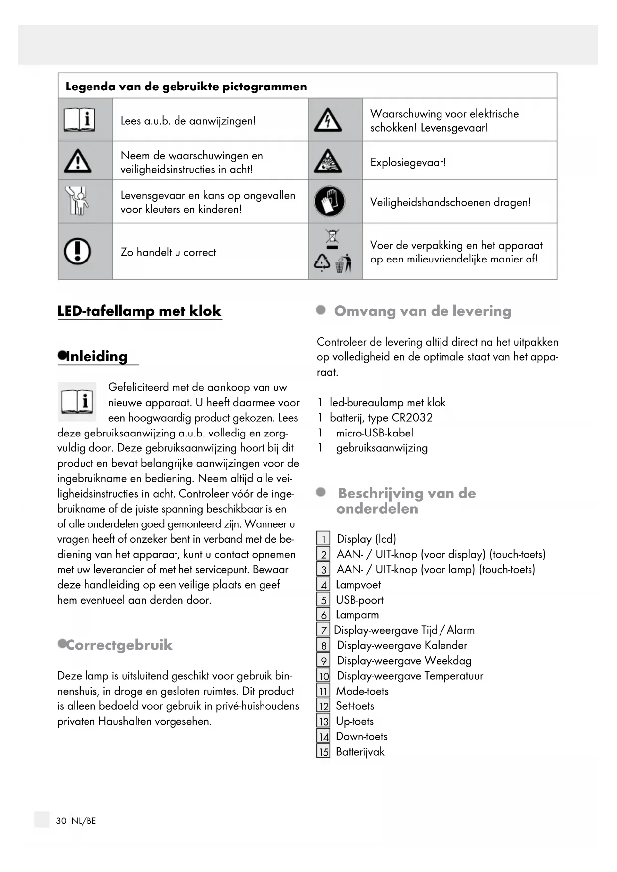 Voer de verpakking en het apparaat op een milieuvriendelijke manier af! LED-tafellamp met klok Inleiding Gefeliciteerd met de aankoop van uw nieuwe apparaat. U heeft daarmee voor een hoogwaardig product gekozen. Lees deze gebruiksaanwijzing a.u.b. volledig en zorg- vuldig door. Deze gebruiksaanwijzing hoort bij dit product en bevat belangrijke aanwijzingen voor de ingebruikname en bediening. Neem altijd alle vei- ligheidsinstructies in acht. Controleer vóór de inge- bruikname of de juiste spanning beschikbaar is en of alle onderdelen goed gemonteerd zijn. Wanneer u vragen heeft of onzeker bent in verband met de be- diening van het apparaat, kunt u contact opnemen met uw leverancier of met het servicepunt. Bewaar deze handleiding op een veilige plaats en geef hem eventueel aan derden door. Correct gebruik Deze lamp is uitsluitend geschikt voor gebruik bin- nenshuis, in droge en gesloten ruimtes. Dit product is alleen bedoeld voor gebruik in privé-huishoudens privaten Haushalten vorgesehen. Omvang van de levering Controleer de levering altijd direct na het uitpakken op volledigheid en de optimale staat van het appa- raat. 1 led-bureaulamp met klok 1 batterij, type CR2032 1 micro-USB-kabel 1 gebruiksaanwijzing Beschrijving van de onderdelen