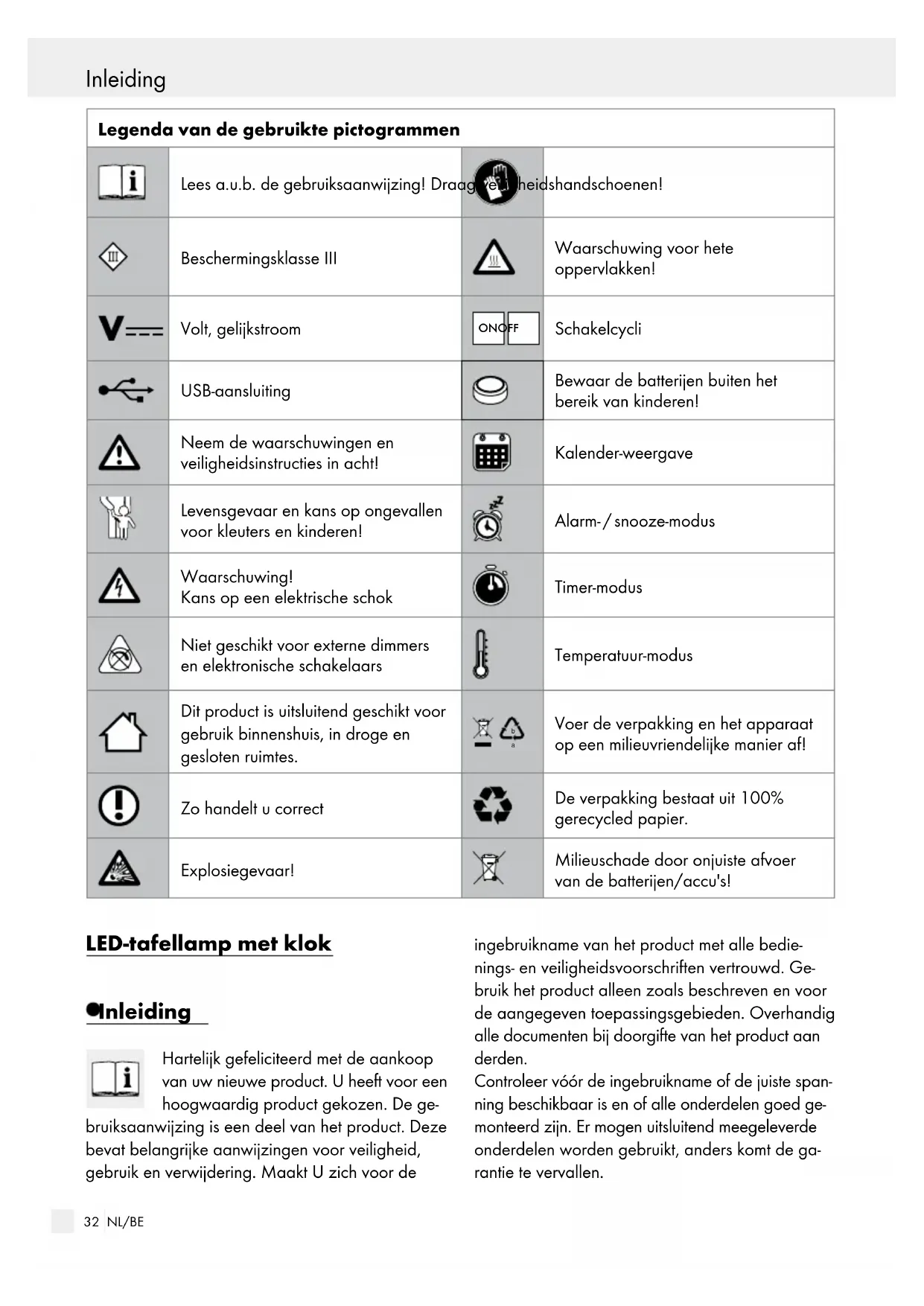 EN KINDEREN! Laat kinderen nooit zonder toezicht bij het verpakkingsmateriaal. Er bestaat gevaar voor verstikking door het verpakkingsmateriaal. Kinderen onderschatten vaak de gevaren. Dit apparaat kan door kinderen vanaf 8 jaar alsmede door personen met verminderde fysieke, sensorische of mentale vaardigheden of een gebrek aan ervaring en kennis worden gebruikt, als zij onder toezicht staan of geïnstrueerd wer- den met betrekking tot het veilige gebruik van het apparaat en zij de hieruit voortvloeiende gevaren begrijpen. Kinderen mogen niet met het apparaat spelen. Reiniging en onderhoud mogen niet door kinderen zonder toezicht worden uitgevoerd. GEVAAR VOOR LETSEL! Laat de lamp of het verpakkings-materiaal niet achteloos rondslingeren. Plastic folie / zakken,34 NL/BE Veiligheid kunststof delen etc. kunnen voor kinderen een gevaarlijk speelgoed zijn. Vermijd levensgevaar door elektrische schokken Controleer de micro-USB-kabel en de lamp al- tijd op eventuele beschadigingen voordat u de lamp oplaadt. Gebruik de lamp nooit wanneer u beschadigingen constateert. Ter voorkoming van gevaren mag de bescha- digde, buitenste flexibele kabel van deze lamp uitsluitend door de fabrikant, zijn serviceverlener of een vergelijkbare vakman worden vervangen! De lichtbron van deze lamp kan niet worden vervangen; als de lichtbron het einde van zijn levensduur heeft bereikt, dient de complete lamp te worden vervangen. Neem in geval van beschadigingen, reparaties of andere problemen aan de lamp contact op met de klantenservice of met een elektricien. Open nooit een van de elektrische bedrijfsmid- delen (bijv. schakelaar, fitting e.d.) en steek ook geen voorwerpen in deze onderdelen. Bij dergelijke handelingen bestaat levensgevaar door een elektrische schok. Controleer vóór het gebruik of de aanwezige netspanning overeenkomt met de vereiste be- drijfsspanning van de lamp (zie „Technische gegevens“). Maak de lamp voorafgaand aan de montage, de demontage en de reiniging los van de micro- USB-kabel. Deze lamp is niet geschikt voor externe dimmers en elektronische schakelaars! Zo handelt u correct Plaats de lamp zodanig dat hij beschermd is tegen vocht en vuil. Wees altijd alert! Let altijd goed op wat u doet en ga steeds verstandig te werk. Dek de lamp niet af met voorwerpen. Een over- matige warmteontwikkeling kan tot brand leiden. Tijdens het gebruik niet van dichtbij in de leds kijken. De leds niet met behulp van een optisch instrument (bijv. vergrootglas) bekijken. Monteer de lamp in geen geval als u niet ge- concentreerd bent of als u zich niet lekker voelt. Veiligheidsinstructies voor batterijen / accu‘s BATTERIJEN BUITEN BEREIK VAN KINDEREN BEWAREN! Het inslikken kan chemische brandwonden, perforatie van zacht weefsel en de dood veroor- zaken. Ernstige brandwonden kunnen binnen 2 uur na het inslikken optreden. Neem direct contact op met een arts. LEVENSGEVAAR! Houd batterijen / accu‘s buiten het bereik van kinderen. Raadpleeg bij inslikken onmiddellijk een arts! EXPLOSIEGEVAAR! Laad niet oplaadbare batterijen nooit op. Sluit de batterijen / accu‘s niet kort en / of open deze niet. Daardoor kan de batterij oververhit raken, in brand vliegen of exploderen. Gooi batterijen / accu‘s nooit in het vuur of water. Stel batterijen / accu‘s nooit bloot aan mecha- nische belastingen. Risico dat de batterijen / accu’s lekken Vermijd extreme omstandigheden en tempera- turen die invloed op de batterijen / accu‘s zou- den kunnen hebben bijv. radiatoren / direct zonlicht. Bij lekkende batterijen / accu‘s het contact van de chemicaliën met de huid, ogen en slijmvlie- zen vermijden! Spoel de desbetreffende plekken direct af met schoon water en raadpleeg on- middellijk een arts! DRAAG VEILIGHEIDSHAND- SCHOENEN! Veiligheid / Ingebruikname35 NL/BE Veiligheid Veiligheid / Ingebruikname Lekkende of beschadigde batterijen / accu‘s kunnen in geval van huidcontact chemische brandwonden veroorzaken. Draag daarom in dit geval geschikte veiligheidshandschoenen. Als de batterijen / accu‘s lekken, dient u deze direct uit het product te halen om beschadigin- gen te vermijden. Gebruik alleen batterijen / accu‘s van hetzelfde type. Gebruik nooit nieuwe en oude batterijen / accu‘s door elkaar! Verwijder de batterijen / accu‘s, als u het product gedurende een langere periode niet gebruikt. Risico op beschadiging van het product Gebruik uitsluitend het aangegeven type batterij / accu! Plaats de batterijen / accu‘s volgens de weer- gegeven polariteit (+) en (-) op batterij / accu en op product. Reinig de contacten van de batterij / accu en die in het batterijvak, voordat u deze plaatst! Verwijder verbruikte batterijen / accu‘s direct uit het product. Ingebruikname Opmerking: verwijder al het verpakkingsmateriaal van het product. Plaats de lamp op een vlakke, horizontale ondergrond. Om het display