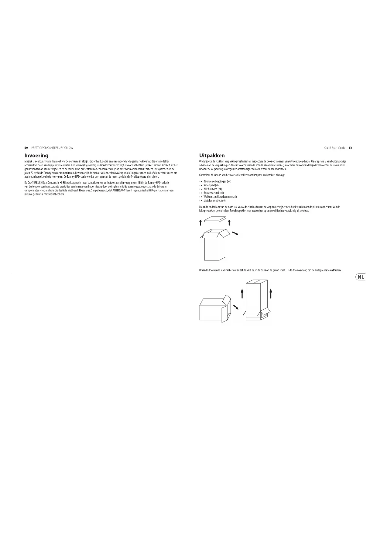 ‘EARTH’ CONNECTION ON AMPLIFIER (OPTIONAL) LINKS REMOVED TO RIGHT SPEAKER Bi-amping breidt het principe van bi-wiring nog een stap verder uit. Bij deze aansluitmogelijkheid worden in elke luidspreker aparte eindversterkers gebruikt voor bas- en treble-signalen. Voor een stereo paar luidsprekers zijn vier mono (of twee stereo) versterkers van hetzelfde type nodig. Als er twee stereoversterkers worden gebruikt, wordt aanbevolen dat de ene versterker basinformatie levert aan de linker- en rechterluidsprekers en de andere de hoge tonen. Het is belangrijk om de verbindingskabels op het aansluitpaneel niet te gebruiken, anders kan er schade aan de versterker ontstaan. Treble-aanpassing Elke luidspreker is uitgerust met twee bedieningselementen die zich op de frontplaat onder het afneembare rooster bevinden. Deze hoogstroomschakelblokken zijn gelabeld ROLL OFF en ENERGY. Ze kunnen worden gebruikt om de gevarieerde akoestische eigenschappen van luisterruimtes te compenseren. De regelaars moeten worden afgesteld met de toonregelaars van de versterker in de 'platte' of niet- gecompenseerde stand. Elke luidspreker moet afzonderlijk worden afgesteld. Door de balansregeling van de versterker te draaien, om eerst de ene luidspreker te selecteren en dan de andere, wordt dit het gemakkelijkst bereikt. De Energy control heeft vijf standen. Hiermee kan de uitvoer van de aandrijfeenheid voor hoge frequentiecompressie worden verhoogd of verlaagd vanuit de lineaire of 'platte' positie over een frequentieband van ongeveer 1 kHz tot 27 kHz. De Roll O-bediening heeft vijf standen (+2, niveau, -2, -4 en -6 dB per octaaf) en zorgt voor afstelling bij extreem hoge frequenties van 5 kHz tot 30 kHz. De Energy-regeling heeft een shelving-eect, terwijl de roll-o-regeling de helling van de extreem hoge frequentierespons verhoogt of verlaagt. De vlakste, meest lineaire respons van de luidspreker wordt verkregen met beide bedieningselementen in de LEVEL-positie, en deze positie moet worden gebruikt voor de eerste luistertests. Als de algehele kwaliteit van het hoogfrequente geluid te prominent lijkt, moeten de –1,5 of –3 posities voor de energieregeling worden geprobeerd. Als het geluid gedempt lijkt in de hoge tonen, kunnen instellingen van +1,5 of +3 de voorkeur hebben. Nadat de instelling van de energieregeling is vastgesteld, kan de Roll O-regeling worden aangepast om de extreem hoge frequentie-inhoud indien nodig te verlagen of iets te verhogen. Onthoud dat de veranderingen die kunnen worden aangebracht door een van beide besturingen van de ene naar de andere positie te verplaatsen, subtiel zijn. Ze zijn misschien niet gemakkelijk te horen als het programmamateriaal zeer weinig inhoud heeft in de betreende frequentieband. Kies een goed uitgebalanceerd muziekstuk met een volledig geluidsspectrum. De juiste instelling wordt gevonden wanneer de luidsprekers niet meer duidelijk zijn en alleen de muzikale uitvoering te horen is. Kabinet zorg De kast is afgewerkt volgens veeleisende normen met behulp van zorgvuldig geselecteerde massief hardhouten lijstwerk en bijpassende neren van echt hout. Het hout mag alleen worden gereinigd met een droge doek of met een lichte toepassing van hoogwaardige siliconenvrije meubelwas, zoals de specialistische Tannoy-was die wordt meegeleverd in het accessoirepakket. Zorg ervoor dat er geen polijstmiddel op het roosterdoek of de gelakte frontplaat komt. Zoals bij alle massief houten meubelen, zal blootstelling aan extreme hitte, kou en wisselende vochtigheid ervoor zorgen dat het hout iets zachter wordt. Daarom wordt aanbevolen om de luidspreker te beschermen tegen extreme omgevingsfactoren om dergelijke gebeurtenissen te voorkomen. Elk hout zal van kleur veranderen wanneer het wordt blootgesteld aan het UV-gehalte van omgevingslicht en na verloop van tijd uitdroogt, vandaar de noodzaak om het hout periodiek te 'voeden' met de meegeleverde was. Rooster verwijderen In de roosters is speciaal akoestisch transparant doek gebruikt. Voor ultieme natuurgetrouwheid zal de liefhebber echter merken dat het het beste is om deze luidsprekers te gebruiken met de roosters verwijderd tijdens het luisteren. Het verwijderen van het rooster is ook nodig om toegang te krijgen tot de bedieningselementen op het voorpaneel. Het voorrooster wordt verwijderd met de meegeleverde sleutel. Draai de sleutel in de sleutelgleuf en trek de onderkant van het rooster weg van de kast. Het rooster zal vanaf de bovenste locatie naar beneden vallen. Zorg ervoor dat u het houten onderste deel van de kast niet beschadigt. Om het rooster terug te plaatsen, steekt u de bovenkant van het rooster in de gleuf in de kast en duwt u het rooster in de uitsparing en vergrendelt het op zijn plaats.56 57Quick Start GuidePRESTIGE GR CANTERBURY GR-OW Introduktion Musik är en konstform som behöver upplevas i all sin skönhet, detalj och nyans utan den minsta färgen som omedelbart kan försämra dess renaste väsen. En riktigt bra högtalardesign gör det möjligt för högtalarsystemet att ta bort sig själv från ljudbilden och presentera musiken på ett sätt som omsluter dig på samma sätt som en liveföreställning. På 1970-talet skapade Tannoy ett antal bildskärmar som för alltid förändrade hur studioingenjörer och ljudler valde att uppleva högkvalitativt ljud. Tannoy HPD-serien blev snabbt några av de mest älskade Hi-Fi-högtalarna genom tiderna. CANTERBURY Dual Concentric Hi-Fi-högtalare, mer än bara en hyllning till sin föregångare, lyfter ytterligare upp Tannoy HPD-arvet med enastående transparent prestanda genom implementering av nya, uppskalade drivrutiner och komponenter - teknik som inte var tillgänglig då. Enkelt uttryckt levererar CANTERBURY legendariska HPD-prestanda till en ny generation musikälskare. Uppackning Undersök alla bitar av förpackningsmaterial och inspektera kartongen för tecken på yttre skador. Om det nns tecken på överdriven skada på förpackningen och skador på högtalaren,