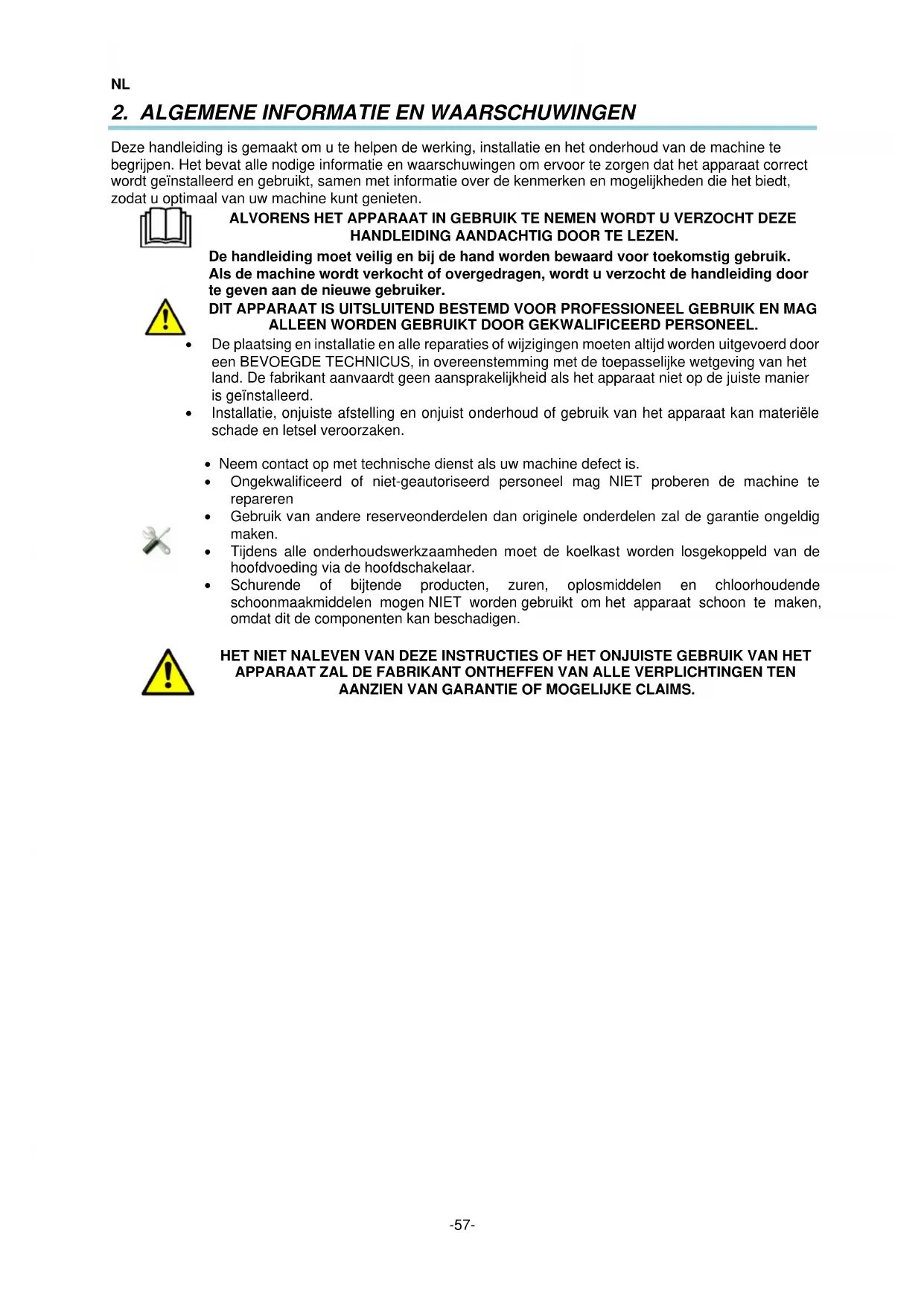 - Ongekwalificeerd of niet-geautoriseerd personeel mag NIET proberen de machine te repareren