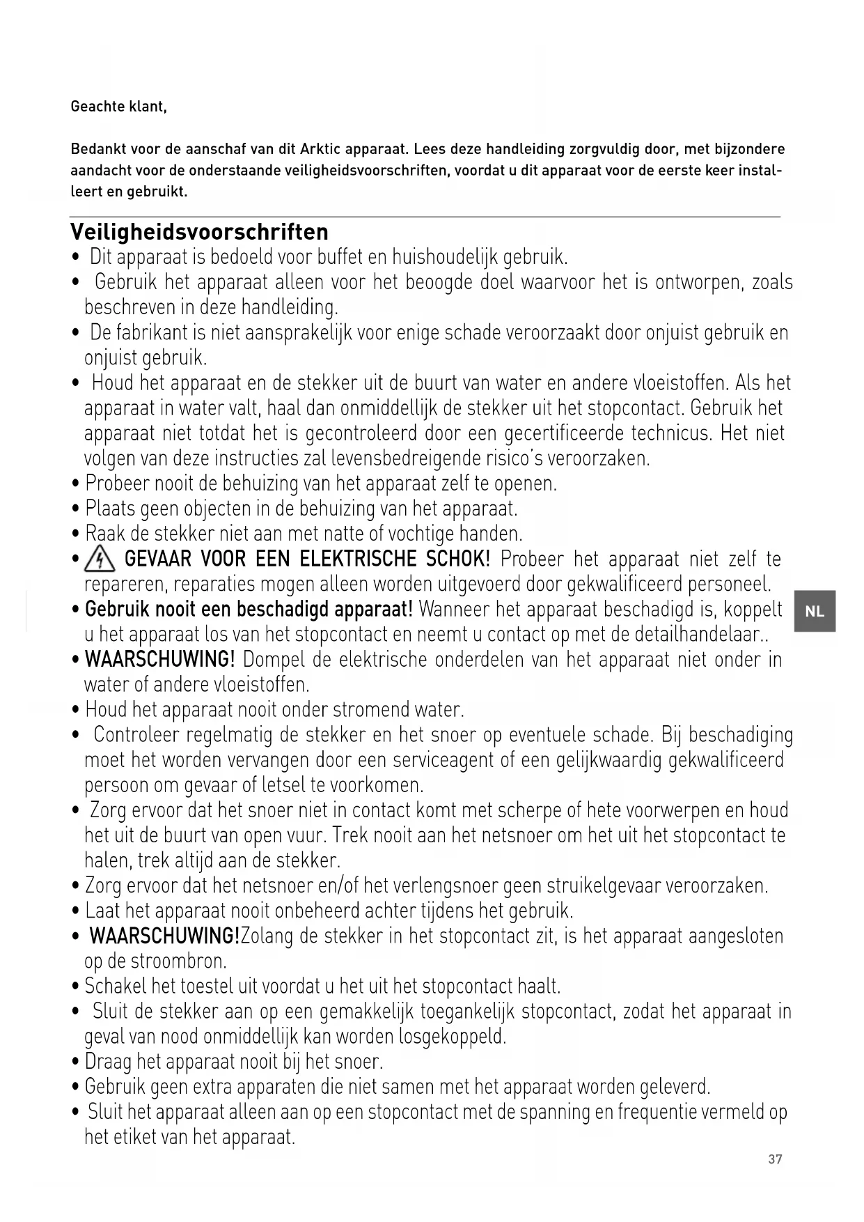 Geachte klant, Bedankt voor de aanschaf van dit Arktic apparaat. Lees deze handleiding zorgvuldig door, met bijzondere aandacht voor de onderstaande veiligheidsvoorschriften, voordat u dit apparaat voor de eerste keer instal- leert en gebruikt. Veiligheidsvoorschriften