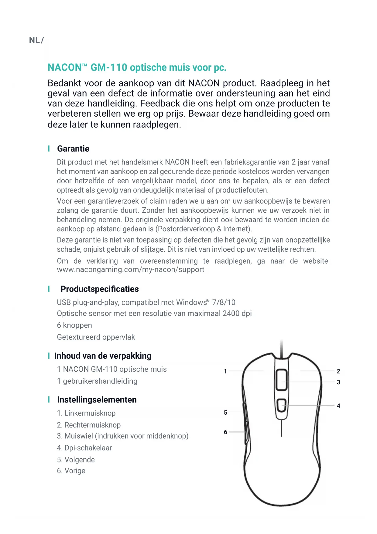 7/8/10 Optische sensor met een resolutie van maximaal 2400 dpi 6 knoppen Getextureerd oppervlak I Inhoud van de verpakking 1 NACON GM-110 optische muis 1 gebruikershandleiding I Instellingselementen