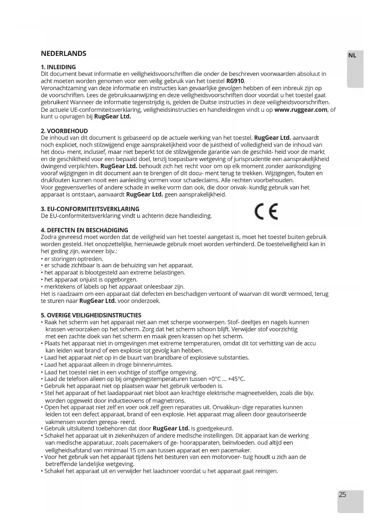 Dit document bevat informatie en veiligheidsvoorschriften die onder de beschreven voorwaarden absoluut in acht moeten worden genomen voor een veilig gebruik van het toestel RG910. Veronachtzaming van deze informatie en instructies kan gevaarlijke gevolgen hebben of een inbreuk zijn op de voorschriften. Lees de gebruiksaanwijzing en deze veiligheidsvoorschriften door voordat u het toestel gaat gebruiken! Wanneer de informatie tegenstrijdig is, gelden de Duitse instructies in deze veiligheidsvoorschriften. De actuele UE-conformiteitsverklaring, veiligheidsinstructies en handleidingen vindt u op www.ruggear.com, of kunt u opvragen bij RugGear Ltd.