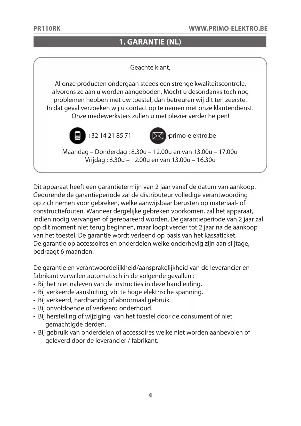 Geachte klant, Al onze producten ondergaan steeds een strenge kwaliteitscontrole, alvorens ze aan u worden aangeboden. Mocht u desondanks toch nog problemen hebben met uw toestel, dan betreuren wij dit ten zeerste. In dat geval verzoeken wij u contact op te nemen met onze klantendienst. Onze medewerksters zullen u met plezier verder helpen! +32 14 21 85 71 info@primo-elektro.be Maandag – Donderdag : 8.30u – 12.00u en van 13.00u – 17.00u Vrijdag : 8.30u – 12.00u en van 13.00u – 16.30u Dit apparaat heeft een garantietermijn van 2 jaar vanaf de datum van aankoop. Gedurende de garantieperiode zal de distributeur volledige verantwoording op zich nemen voor gebreken, welke aanwijsbaar berusten op materiaal- of constructiefouten. Wanneer dergelijke gebreken voorkomen, zal het apparaat, indien nodig vervangen of gerepareerd worden. De garantieperiode van 2 jaar zal op dit moment niet terug beginnen, maar loopt verder tot 2 jaar na de aankoop van het toestel. De garantie wordt verleend op basis van het kassaticket. De garantie op accessoires en onderdelen welke onderhevig zijn aan slijtage, bedraagt 6 maanden. De garantie en verantwoordelijkheid/aansprakelijkheid van de leverancier en fabrikant vervallen automatisch in de volgende gevallen :