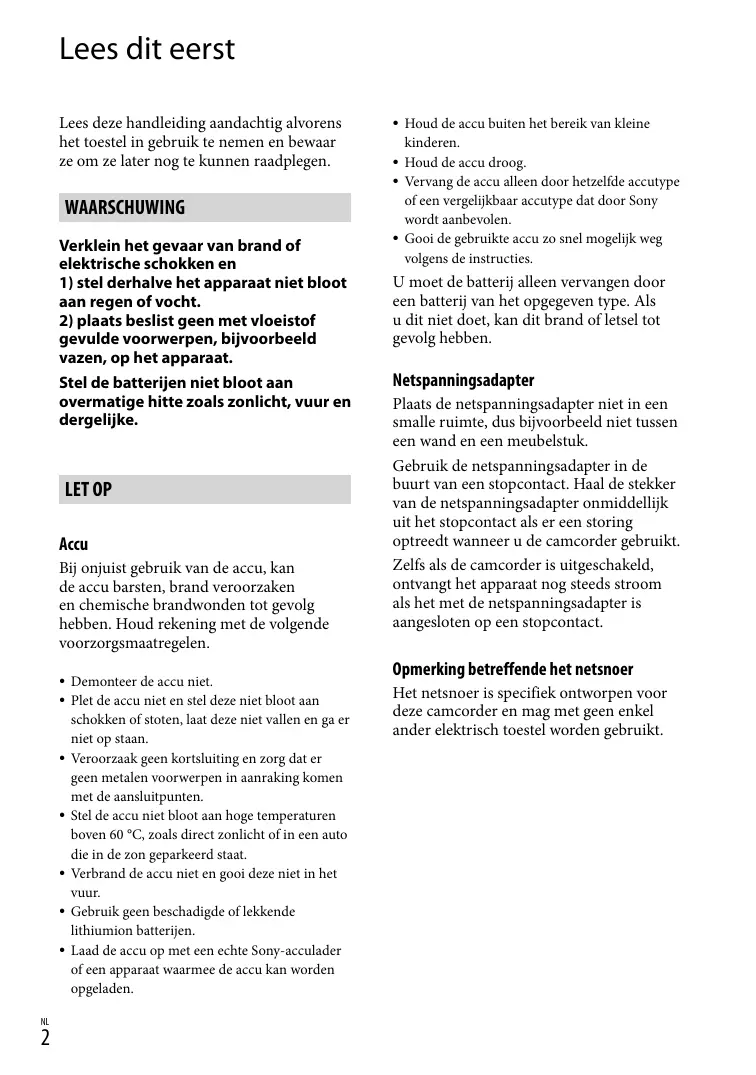 Houd de accu buiten het bereik van kleine kinderen. Houd de accu droog. Vervang de accu alleen door hetzelfde accutype of een vergelijkbaar accutype dat door Sony wordt aanbevolen. Gooi de gebruikte accu zo snel mogelijk weg volgens de instructies. U moet de batterij alleen vervangen door een batterij van het opgegeven type. Als u dit niet doet, kan dit brand of letsel tot gevolg hebben. Netspanningsadapter Plaats de netspanningsadapter niet in een smalle ruimte, dus bijvoorbeeld niet tussen een wand en een meubelstuk. Gebruik de netspanningsadapter in de buurt van een stopcontact. Haal de stekker van de netspanningsadapter onmiddellijk uit het stopcontact als er een storing optreedt wanneer u de camcorder gebruikt. Zelfs als de camcorder is uitgeschakeld, ontvangt het apparaat nog steeds stroom als het met de netspanningsadapter is aangesloten op een stopcontact. Opmerking betreffende het netsnoer Het netsnoer is specifiek ontworpen voor deze camcorder en mag met geen enkel ander elektrisch toestel worden gebruikt.