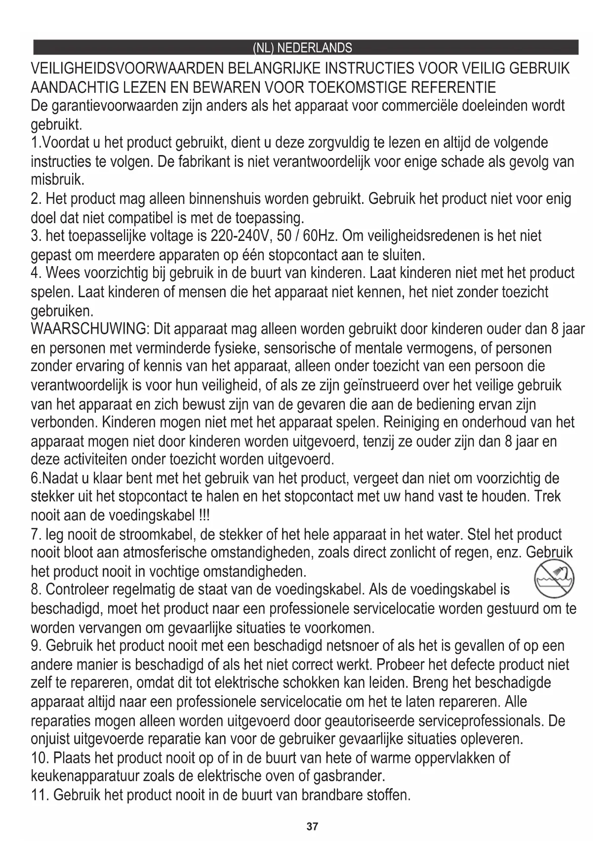 AANDACHTIG LEZEN EN BEWAREN VOOR TOEKOMSTIGE REFERENTIE WAARSCHUWING: Dit apparaat mag alleen worden gebruikt door kinderen ouder dan 8 jaar en personen met verminderde fysieke, sensorische of mentale vermogens, of personen zonder ervaring of kennis van het apparaat, alleen onder toezicht van een persoon die verantwoordelijk is voor hun veiligheid, of als ze zijn geïnstrueerd over het veilige gebruik van het apparaat en zich bewust zijn van de gevaren die aan de bediening ervan zijn verbonden. Kinderen mogen niet met het apparaat spelen. Reiniging en onderhoud van het apparaat mogen niet door kinderen worden uitgevoerd, tenzij ze ouder zijn dan 8 jaar en deze activiteiten onder toezicht worden uitgevoerd. 6.Nadat u klaar bent met het gebruik van het product, vergeet dan niet om voorzichtig de stekker uit het stopcontact te halen en het stopcontact met uw hand vast te houden. Trek nooit aan de voedingskabel !!!