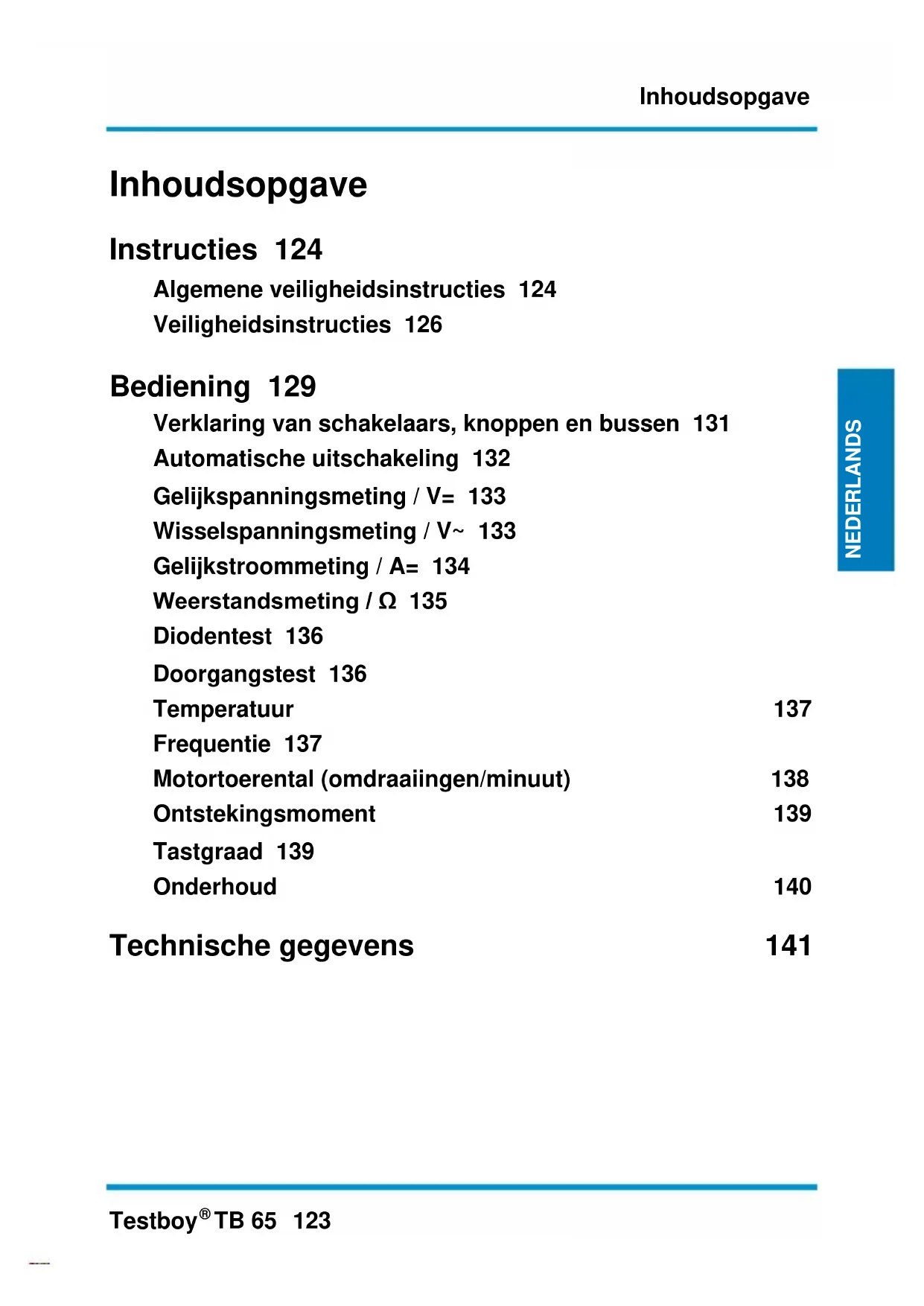 TB 65 123 NEDERLANDS NEDERLANDS NEDERLANDS NEDE RLANDS Inhoudsopgave Instructies 124 Algemene veiligheidsinstructies 124 Veiligheidsinstructies 126 Bediening 129 Verklaring van schakelaars, knoppen en bussen 131 Automatische uitschakeling 132 Gelijkspanningsmeting / V= 133 Wisselspanningsmeting / V~ 133 Gelijkstroommeting / A= 134 Weerstandsmeting / Ω 135 Diodentest 136 Doorgangstest 136 Temperatuur 137 Frequentie 137 Motortoerental (omdraaiingen/minuut) 138 Ontstekingsmoment 139 Tastgraad 139 Onderhoud 140 Technische gegevens 141Instructies