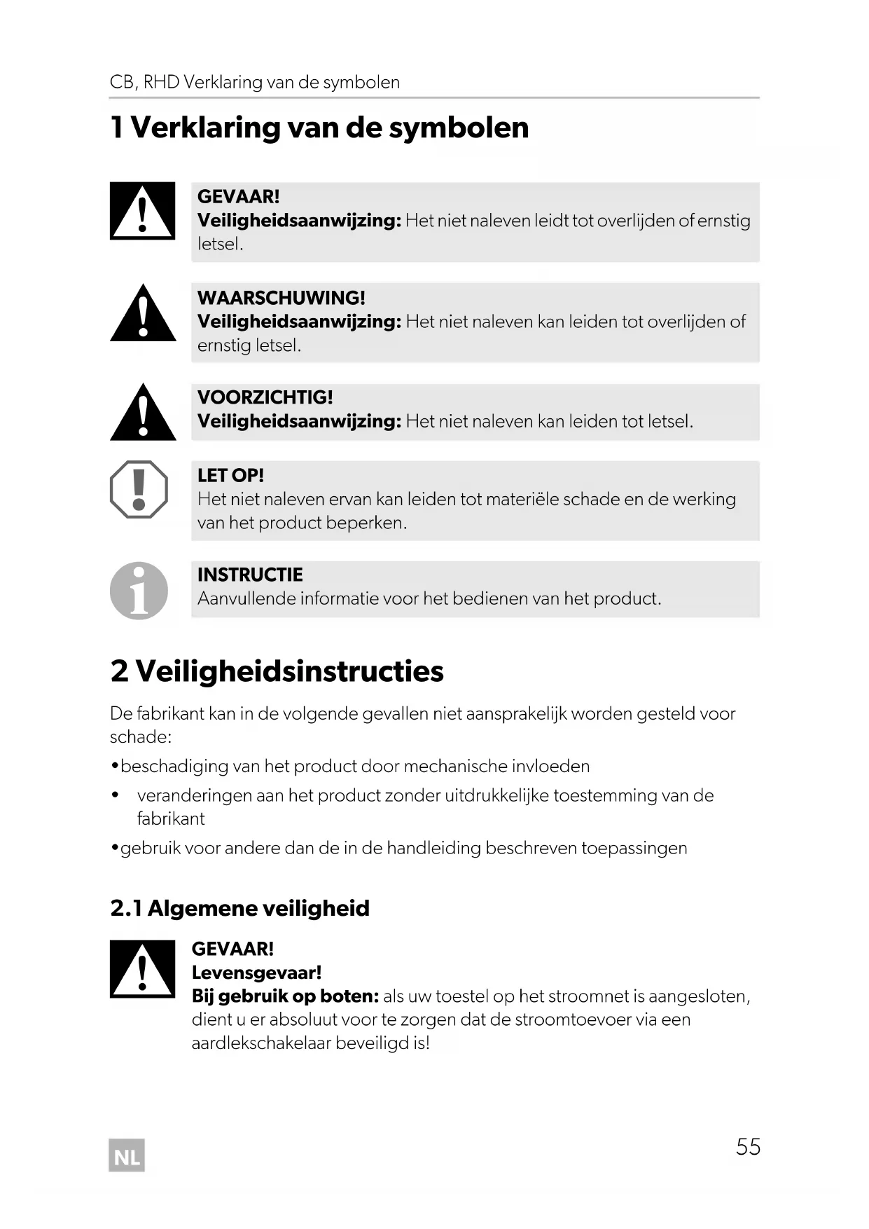 GEVAAR! Levensgevaar! Bij gebruik op boten: als uw toestel op het stroomnet is aangesloten, dient u er absoluut voor te zorgen dat de stroomtoevoer via een aardlekschakelaar beveiligd is! GEVAAR! Veiligheidsaanwijzing: Het niet naleven leidt tot overlijden of ernstig letsel. WAARSCHUWING! Veiligheidsaanwijzing: Het niet naleven kan leiden tot overlijden of ernstig letsel. VOORZICHTIG! Veiligheidsaanwijzing: Het niet naleven kan leiden tot letsel. LET OP! Het niet naleven ervan kan leiden tot materiële schade en de werking van het product beperken. INSTRUCTIE Aanvullende informatie voor het bedienen van het product. RHD-CB--O-West.book Seite 55 Mittwoch, 14. Juni 2017 3:39 15NL Veiligheidsinstructies CB, RHD