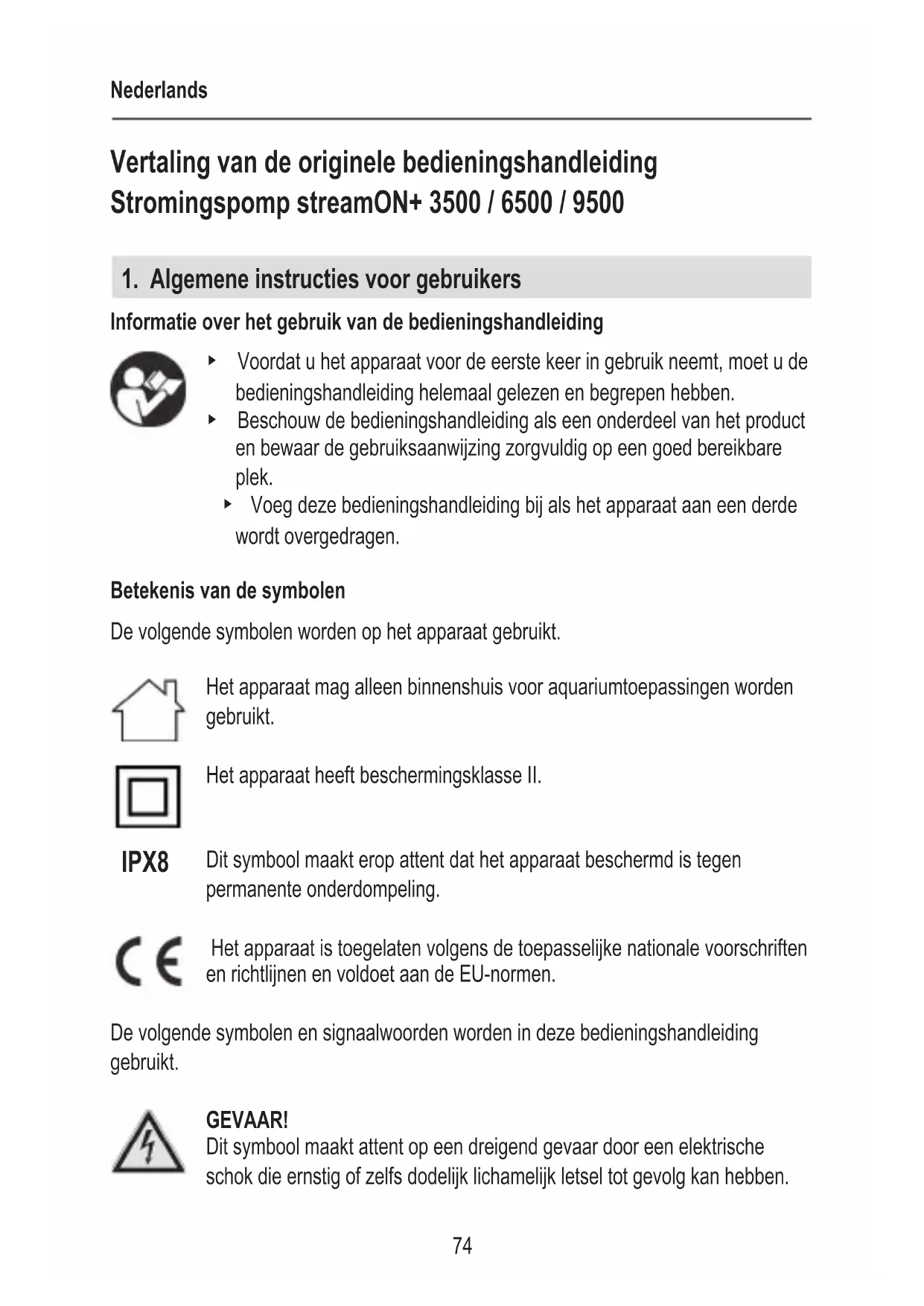 Informatie over het gebruik van de bedieningshandleiding ▶ Voordat u het apparaat voor de eerste keer in gebruik neemt, moet u de bedieningshandleiding helemaal gelezen en begrepen hebben. ▶ Beschouw de bedieningshandleiding als een onderdeel van het product en bewaar de gebruiksaanwijzing zorgvuldig op een goed bereikbare plek. ▶ Voeg deze bedieningshandleiding bij als het apparaat aan een derde wordt overgedragen. Betekenis van de symbolen De volgende symbolen worden op het apparaat gebruikt. Het apparaat mag alleen binnenshuis voor aquariumtoepassingen worden gebruikt. Het apparaat heeft beschermingsklasse II. Dit symbool maakt erop attent dat het apparaat beschermd is tegen permanente onderdompeling. Het apparaat is toegelaten volgens de toepasselijke nationale voorschriften en richtlijnen en voldoet aan de EU-normen. De volgende symbolen en signaalwoorden worden in deze bedieningshandleiding gebruikt. GEVAAR! Dit symbool maakt attent op een dreigend gevaar door een elektrische schok die ernstig of zelfs dodelijk lichamelijk letsel tot gevolg kan hebben. IPX8Nederlands