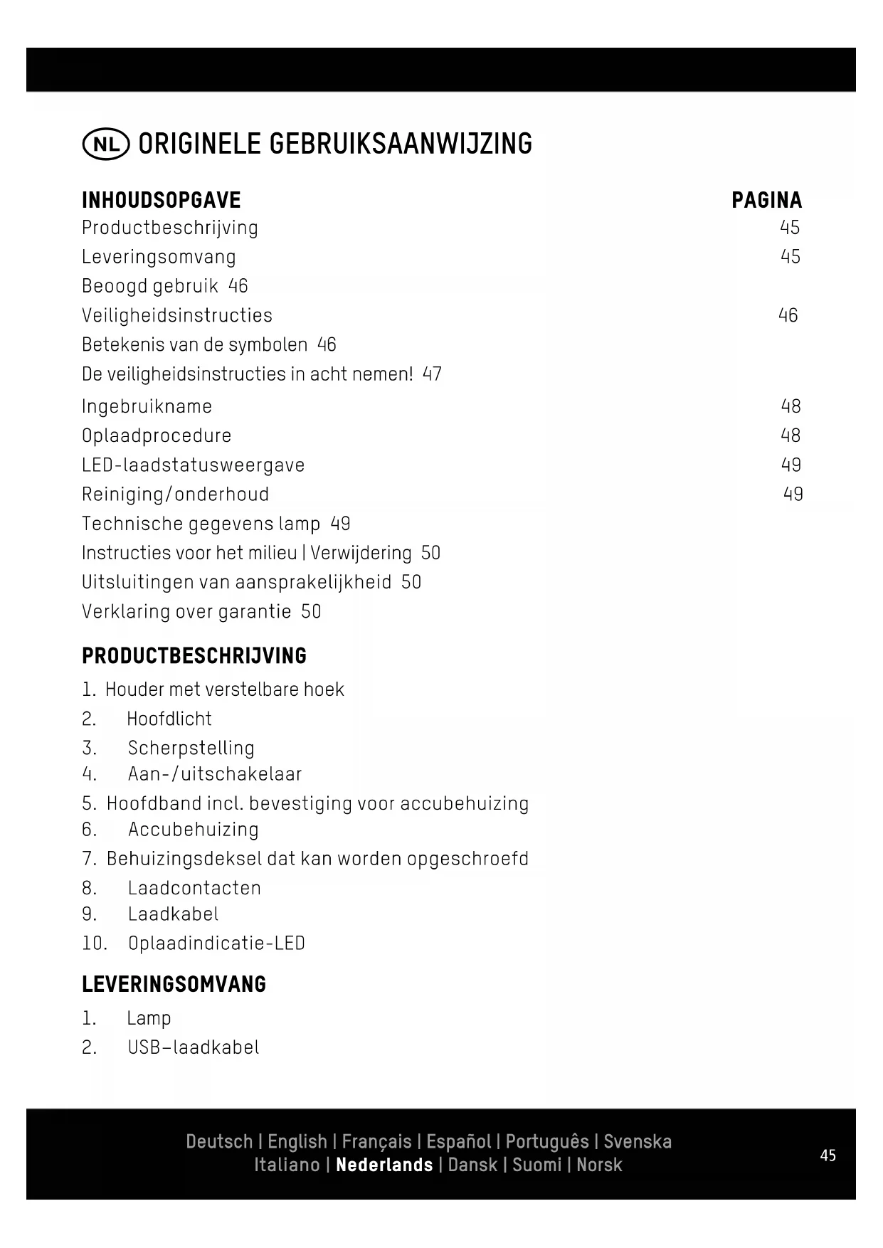 Productbeschrijving 45 Leveringsomvang 45 Beoogd gebruik 46 Veiligheidsinstructies 46 Betekenis van de symbolen 46 De veiligheidsinstructies in acht nemen! 47 Ingebruikname 48 Oplaadprocedure 48 LED-laadstatusweergave 49 Reiniging/onderhoud 49 Technische gegevens lamp 49 Instructies voor het milieu | Verwijdering 50 Uitsluitingen van aansprakelijkheid 50 Verklaring over garantie 50 Deutsch | English | Français | Español | Português | Svenska Italiano | Nederlands | Dansk | Suomi | Norsk Deutsch | English | Français | Español | Português | Svenska Italiano | Nederlands | Dansk | Suomi | Norsk46