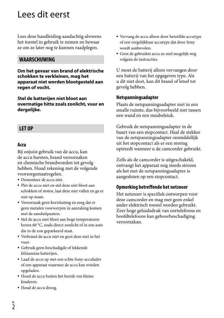 Vervang de accu alleen door hetzelfde accutype of een vergelijkbaar accutype dat door Sony wordt aanbevolen. Gooi de gebruikte accu zo snel mogelijk weg volgens de instructies. Demonteer de accu niet. Plet de accu niet en stel deze niet bloot aan schokken of stoten, laat deze niet vallen en ga er niet op staan. Veroorzaak geen kortsluiting en zorg dat er geen metalen voorwerpen in aanraking komen met de aansluitpunten. Stel de accu niet bloot aan hoge temperaturen boven 60 °C, zoals direct zonlicht of in een auto die in de zon geparkeerd staat. Verbrand de accu niet en gooi deze niet in het vuur. Gebruik geen beschadigde of lekkende lithiumion batterijen. Laad de accu op met een echte Sony-acculader of een apparaat waarmee de accu kan worden opgeladen. Houd de accu buiten het bereik van kleine kinderen. Houd de accu droog. Plaats de netspanningsadapter niet in een smalle ruimte, dus bijvoorbeeld niet tussen een wand en een meubelstuk. Gebruik de netspanningsadapter in de buurt van een stopcontact. Haal de stekker van de netspanningsadapter onmiddellijk uit het stopcontact als er een storing optreedt wanneer u de camcorder gebruikt. Zelfs als de camcorder is uitgeschakeld, ontvangt het apparaat nog steeds stroom als het met de netspanningsadapter is aangesloten op een stopcontact. Opmerking betreffende het netsnoer Het netsnoer is specifiek ontworpen voor deze camcorder en mag met geen enkel ander elektrisch toestel worden gebruikt. Zeer hoge geluidsdruk van oortelefoons en hoofdtelefoons kan gehoorbeschadiging veroorzakan.