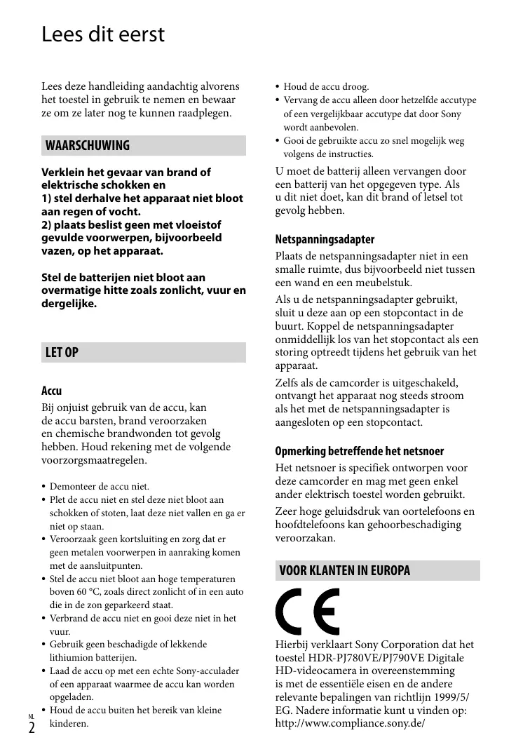 VOOR KLANTEN IN EUROPA Hierbij verklaart Sony Corporation dat het toestel HDR-PJ780VE/PJ790VE Digitale HD-videocamera in overeenstemming is met de essentiële eisen en de andere relevante bepalingen van richtlijn 1999/5/ EG. Nadere informatie kunt u vinden op: http://www.compliance.sony.de/
