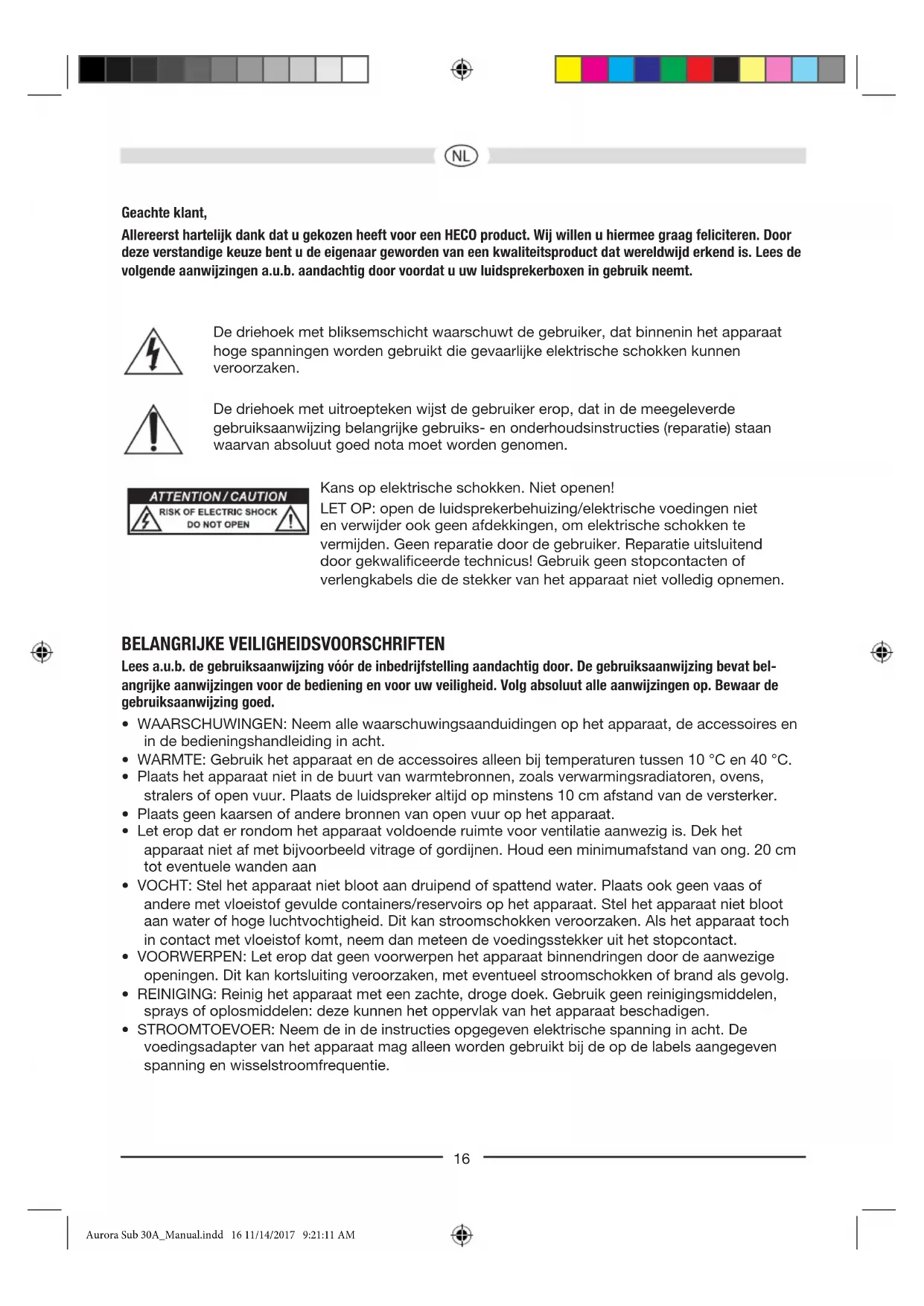 - STROOMTOEVOER: Neem de in de instructies opgegeven elektrische spanning in acht. De voedingsadapter van het apparaat mag alleen worden gebruikt bij de op de labels aangegeven spanning en wisselstroomfrequentie. Aurora Sub 30A_Manual.indd 16 11/14/2017 9:21:11 AM17