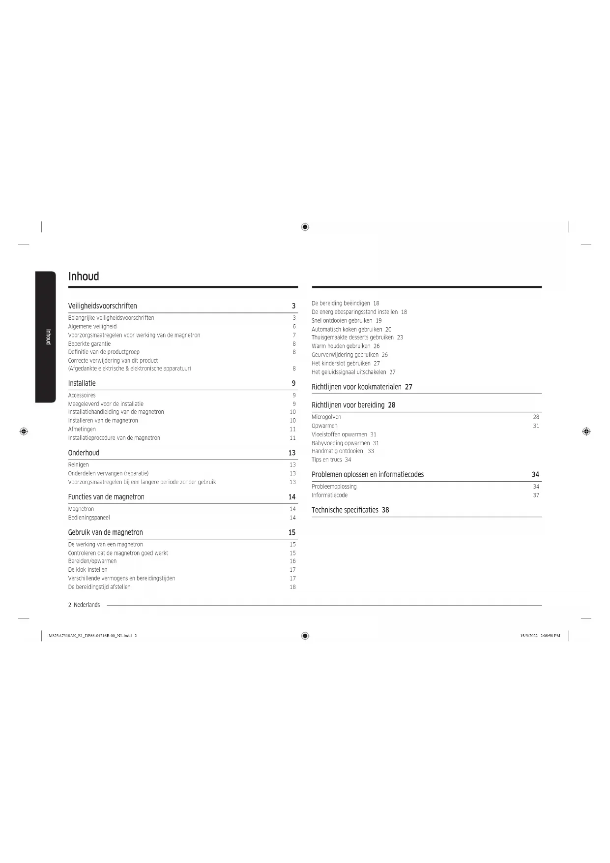 - B&B-achtige omgevingen. Gebruik alleen kookmaterialen die geschikt zijn voor gebruik in magnetrons. Vanwege het risico op ontbranding raden wij u aan de oven in het oog te houden wanneer u voedsel verwarmt dat in plastic of papier is verpakt. De magnetron is bedoeld voor het verwarmen van voedsel en dranken. Het drogen van voedsel of kleding en het verwarmen van warmtekussens, pantoffels, sponzen, vochtige doeken en dergelijke kan leiden tot risico op letsel, ontbranding of brand. Als er rook uit de magnetron komt, schakelt u het apparaat uit of haalt u de stekker uit het stopcontact en laat u de deur dicht om eventuele vlammen te doven. Vloeistoffen die met de magnetron zijn verwarmd, kunnen buiten de magnetron alsnog aan de kook raken en overkoken. Daarom moet u voorzichtig zijn bij het oppakken. De inhoud van zuigessen en potjes met babyvoeding moeten worden geroerd of geschud en de temperatuur moet voor gebruik worden gecontroleerd om brandwonden te voorkomen. MS23A7318AK_E1_DE68-04716B-00_NL.indd 3MS23A7318AK_E1_DE68-04716B-00_NL.indd 3 15/3/2022 2:08:58 PM15/3/2022 2:08:58 PM4 Nederlands Veiligheidsvoorschriften Veiligheidsvoorschriften Ongepelde eieren en hele hardgekookte eieren mogen niet in de magnetron worden verwarmd omdat ze kunnen exploderen, zelfs nadat de magnetron niet meer verwarmt. U moet de oven regelmatig reinigen en voedselresten verwijderen. Als de oven niet wordt schoongehouden, kan het oppervlak beschadigd raken. Hierdoor kan de levensduur van het apparaat nadelig worden beïnvloed en kunnen mogelijk gevaarlijke situaties ontstaan. Dit apparaat is alleen bedoeld om te worden ingebouwd. Het apparaat mag niet in een kast worden geplaatst. Het gebruik van metalen containers voor voedsel en dranken is niet toegestaan in de magnetron. Let erop dat u het draaiplateau niet verplaatst als u een schaal/ container uit het apparaat pakt. Gebruik geen stoomreiniger om het apparaat te reinigen. Het apparaat mag niet te nat worden schoongemaakt. Het apparaat is niet bedoeld voor installatie in mobiele voertuigen, caravans en soortgelijke voertuigen. Dit apparaat is niet bedoeld voor gebruik door personen (inclusief kinderen) met een verminderd fysiek, zintuiglijk of mentaal vermogen, of met onvoldoende ervaring en kennis, tenzij deze toestemming of instructies met betrekking tot het gebruik van het apparaat hebben gekregen van een persoon die verantwoordelijk is voor hun veiligheid. Er moet toezicht op kinderen worden gehouden om te voorkomen dat ze met het apparaat gaan spelen. Dit apparaat kan door kinderen vanaf acht jaar en door personen met een verminderd fysiek, zintuiglijk of mentaal vermogen, of gebrek aan ervaring en kennis, worden gebruikt als ze onder toezicht staan of instructies hebben gekregen omtrent het veilige gebruik van het apparaat en ze de risico's begrijpen. Kinderen mogen niet met het apparaat spelen. Kinderen mogen alleen onder toezicht reinigings- en onderhoudswerkzaamheden uitvoeren. Dit apparaat moet na de installatie losgekoppeld kunnen worden van het stroomnet. Deze uitschakeling kan gebeuren door de stekker bereikbaar te houden of door conform de bedradingsvoorschriften een schakelaar in de vaste bedrading op te nemen. MS23A7318AK_E1_DE68-04716B-00_NL.indd 4MS23A7318AK_E1_DE68-04716B-00_NL.indd 4 15/3/2022 2:08:58 PM15/3/2022 2:08:58 PMNederlands 5 Veiligheidsvoorschriften Als het netsnoer is beschadigd, moet u het laten vervangen door de fabrikant of de onderhoudsdienst van de leverancier, of door een andere gekwaliceerde monteur, om gevaarlijke situaties te voorkomen. Deze oven moet in de juiste richting en op de juiste hoogte worden geplaatst, zodat u gemakkelijk bij de opening en het bedieningsgedeelte kunt. Voordat u de oven voor het eerst gebruikt, moet u deze 10 minuten met water laten werken. Als de oven vreemde geluiden maakt of als er een brandlucht of rook uit komt, moet u onmiddellijk de stroom uitschakelen en contact opnemen met het dichtstbijzijnde servicecentrum. WAARSCHUWING: Als het apparaat in de combistand wordt gebruikt, mogen kinderen vanwege de gebruikte temperatuur de magnetron alleen onder toezicht van een volwassene gebruiken. Het apparaat wordt tijdens het gebruik heet. U moet voorzichtig zijn dat u de verwarmingselementen in de magnetron niet aanraakt. WAARSCHUWING: De toegankelijke delen kunnen tijdens het gebruik heet worden. Jonge kinderen moeten uit de buurt worden gehouden. Gebruik geen grove schuurmiddelen of scherpe metalen schrapers om het glas van de deur te reinigen, omdat dit krassen op het oppervlak kan veroorzaken die verbrijzeling van het glas kunnen veroorzaken. Er mag geen stoomreiniger worden gebruikt. WAARSCHUWING: Zorg ervoor dat het apparaat uitgeschakeld is voordat de lamp wordt vervangen, zodat er geen elektrische schok kan optreden. Het apparaat mag niet achter een sierdeur geïnstalleerd worden, om oververhitting te voorkomen. WAARSCHUWING: Het apparaat en de toegankelijke delen worden heet bij gebruik. U moet voorzichtig zijn dat u de verwarmingselementen niet aanraakt. Kinderen jonger dan 8 jaar moeten uit de buurt worden gehouden, tenzij er voortdurend toezicht is. OPGELET: Het kookproces moet onder toezicht gebeuren. Een kookproces van korte duur moet voortdurend onder toezicht gebeuren. De deur of de buitenkant kan, bij gebruik van het apparaat, heet worden. MS23A7318AK_E1_DE68-04716B-00_NL.indd 5MS23A7318AK_E1_DE68-04716B-00_NL.indd 5 15/3/2022 2:08:58 PM15/3/2022 2:08:58 PM6 Nederlands Veiligheidsvoorschriften Veiligheidsvoorschriften Algemene veiligheid Wijzigingen of reparaties mogen uitsluitend door gekwaliceerde monteurs worden uitgevoerd. Verwarm geen voedsel en vloeistoffen in een afgesloten verpakking voor de magnetronfunctie. Gebruik geen wasbenzine, thinner, alcohol, stoom of hogedrukreinigers om de oven te reinigen. De oven mag niet worden geïnstalleerd: in de buurt van een verwarming of brandbaar materiaal; op plaatsen die vochtig, olieachtig of stofg zijn, of aan direct zonli