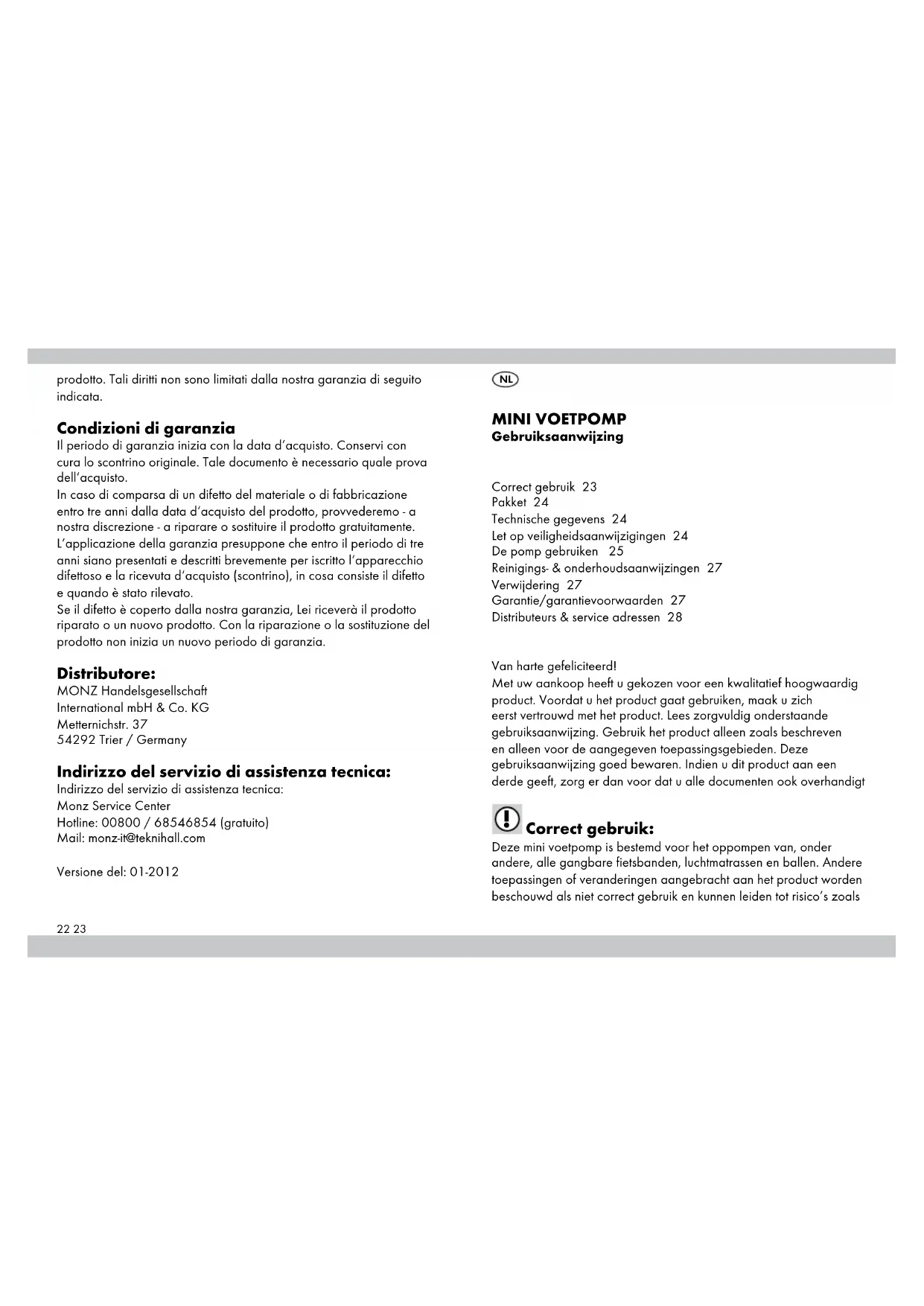 Reinigings- & onderhoudsaanwijzingen: (E1/E2) - met vochtige doek reinigen - niet in water onderdompelen - controleer regelmatig of de schroeven van de pomp voor gebruik goed vast zitten. - eventueel de pomp met zuurvrij vet een keer per jaar insmeren Om dit te doen moet u de moer op de pompcilinder losschroeven en vervolgens kunt u de pompzuiger met de veer eruit halen en de pakking insmeren. Montage wordt uitgevoerd in omgekeerde volgorde. Verwijdering: De verpakking bestaat voor 100% uit milieuvriendelijke materialen, die u in uw plaatselijke recycling afvalbak kunt deponeren. Voor meer informatie over afvalverwijderingsmogelijkheden kunt u bij uw gemeente of stadsbestuur terecht. Garantie: Garantie van de Monz Handelsgesellschaft International MBH & CO. KG. Geachte klant, u krijgt op dit apparaat 3 jaar garantie vanaf de aankoopdatum. In geval van gebreken aan dit product heeft u bepaalde rechten t.o.v. De verkoper van dit product. Deze rechten worden niet aangetast door onze onderstaande garantie.28 Garantievoorwaarden De garantieperiode begint op de aankoopdatum. Zorg dat u de originele kwitantie goed bewaart. Dit document is vereist als bewijs van aankoop. Indien binnen een periode van drie jaar vanaf de aankoopdatum van dit product materiaal- of fabricagefouten optreden, wordt het product door ons - naar keuze - gratis gerepareerd of vervangen. Deze garantievergoeding veronderstelt dat binnen de periode van drie jaar het defecte apparaat en de kwitantie ( kassabon) worden ontvangen en schriftelijk wordt toegelicht wat het defect inhoudt en wanneer het is opgetreden. Indien het defect door onze garantie gedekt wordt, ontvangt u een gerepareerd of nieuw product van ons. Met reparatie of vervanging van het product begint geen nieuwe garantieperiode. Distributeur: MONZ Handelsgesellschaft International mbH & Co. KG Metternichstr. 37 54292 Trier / Germany Serviceadressen: