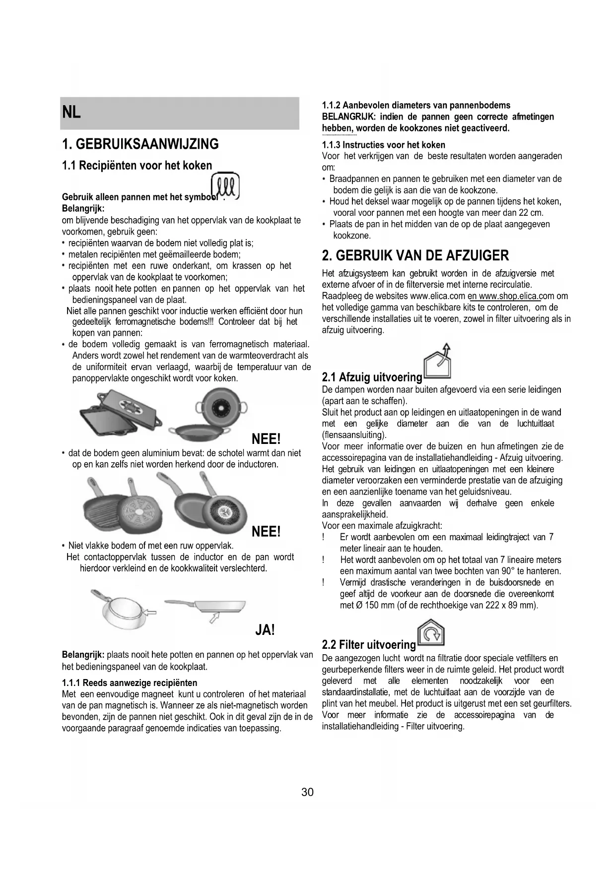 Het afzuigsysteem kan gebruikt worden in de afzuigversie met externe afvoer of in de filterversie met interne recirculatie. Raadpleeg de websites www.elica.com en www.shop.elica.com om het volledige gamma van beschikbare kits te controleren, om de verschillende installaties uit te voeren, zowel in filter uitvoering als in afzuig uitvoering.