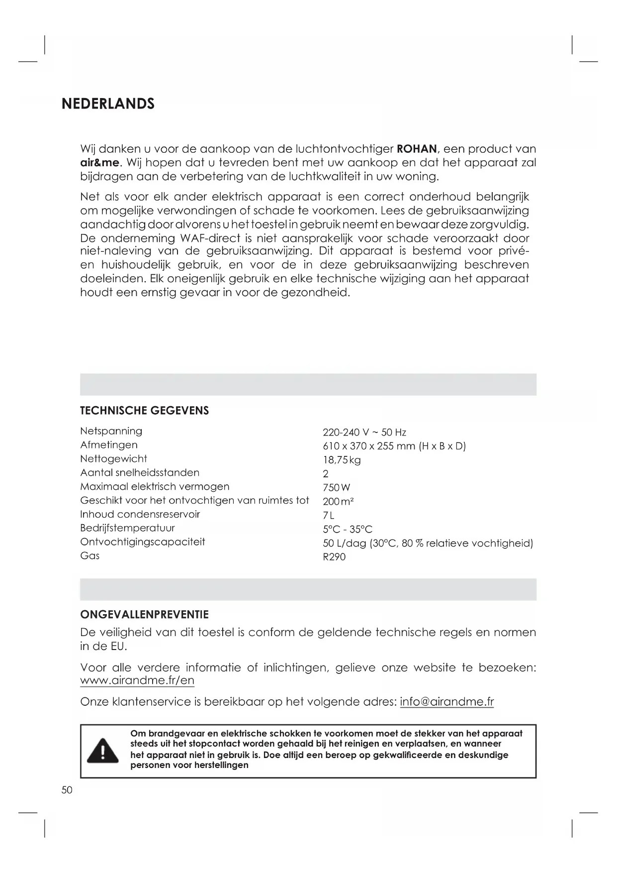> Het [ Kinderslot ] is geactiveerd en de andere bedieningsknoppen zijn vergrendeld. DIGITAAL DISPLAY57 FAQ Probleem Oorzaak Oplossing Het apparaat start niet > Het product is niet correct aangesloten of de spanning van het apparaat komt niet overeen met de netspanning. > Controleer de netspanning en het elektriciteitsnet. Steek vervolgens de stekker opnieuw in het stopcontact. Vermijd het gebruik van tafelcontactdozen en multistekkers. > Er is een probleem met het elektriciteitsnet van de woning. > Het condensreservoir is vol. > Leeg het condensreservoir. > Het condensreservoir is niet correct geïnstalleerd. > Duw het reservoir op de juiste manier terug in de luchtontvochtiger. Het apparaat werkt minder goed (minder water in het reservoir) > De verwijderbare lter is verontreinigd en belemmert de luchtstroom. > Maak de verwijderbare lter schoon. > De luchtinlaat of -uitlaat is geblokkeerd. > Laat minstens 50 cm ruimte vrij aan de achterzijde, voorzijde en zijkanten van het apparaat. > De temperatuur is te laag. > Bij een temperatuur onder 5°C wordt de [ Anti-vries ]-modus geactiveerd. Om deze reden functioneert het apparaat niet op maximale ontvochtigingscapaciteit. > De luchtvochtigheid in de ruimte is al laag. Abnormaal geluid > De ventilator is geblokkeerd. > Controleer of er voorwerpen zijn die de luchtstroom hinderen of belemmeren. > Het apparaat functioneert niet correct. > Neem contact op met de klantenservice van de winkel waar u het apparaat hebt gekocht. > Het apparaat produceert een licht ruisend geluid. > Dit geluid wordt geproduceerd door het koelgas. Dit is normaal. Lekkage > Het apparaat staat niet recht of niet stabiel. > Plaats het apparaat op een vlakke ondergrond en start het opnieuw op. > De afvoerslang is niet correct aangesloten op het apparaat. > Sluit de afvoerslang correct aan. > De afvoerslang is gebogen, geknikt of verstopt. > Ontstop de afvoerslang en leg hem in de juiste positie. Het apparaat produceert geen lucht > De luchtlter is verstopt. > Zie rubriek "Onderhoud". De lucht die uit het apparaat komt, is warm > Om luchtafvoer in de ruimte mogelijk te maken, verwarmt de compressor van de luchtontvochtiger zachtjes de omgevingslucht. > Dit is normaal.58 Dziękujemy za zakup osuszacza powietrza ROHAN, marki air&me. Mamy nadzieję, że przyniesie Ci pełną satysfakcję i poprawi jakość powietrza w pomieszczeniach. Podobnie jak w przypadku wszystkich urządzeń elektrycznych, ważne jest właściwe użytkowanie urządzenia, w celu uniknięcia wszelkiego rodzaju szkód i obrażeń. Przed uruchomieniem urządzenia prosimy o zapoznanie się z instrukcją i stosowanie się do wskazówek w niej zawartych. Nie ponosimy odpowiedzialności za uszkodzenia wynikłe z użytkowania niezgodnego z niniejszą instrukcją obsługi. Osuszacz jest przeznaczony do użytku domowego, w celach opisanych w instrukcji. Wykorzystywanie go w innych celach może byc groźne dla zdrowia i życia. POLSKI
