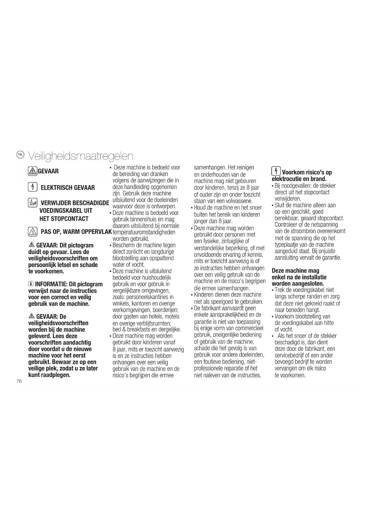 Deze machine mag worden gebruikt door kinderen vanaf 8 jaar, mits er toezicht aanwezig is en ze instructies hebben ontvangen over een veilig gebruik van de machine en de risico’s begrijpen die ermee samenhangen. Het reinigen en onderhouden van de machine mag niet gebeuren door kinderen, tenzij ze 8 jaar of ouder zijn en onder toezicht staan van een volwassene.