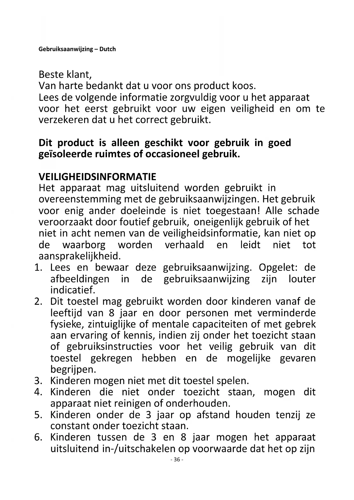 Uppfyller kraven i EU-rådets direktiv: KOMMISSIONENS FÖRORDNING (EU) nr. 2015/1188 från 28 april 2015 och ändring av KOMMISSIONENS FÖRORDNING (EU) 2016/2282 för genomförande av Europaparlamentets och rådets direktiv 2009/125/EG gällande krav på ekodesign för lokala rumsvärmare För information till kunden för hur man installerar, använder och underhåller produkten, WEEE-information, vänligen kontrollera bruksanvisningen som är inkluderad i förpackningen.- 36 - Gebruiksaanwijzing – Dutch Beste klant, Van harte bedankt dat u voor ons product koos. Lees de volgende informatie zorgvuldig voor u het apparaat voor het eerst gebruikt voor uw eigen veiligheid en om te verzekeren dat u het correct gebruikt. Dit product is alleen geschikt voor gebruik in goed geïsoleerde ruimtes of occasioneel gebruik. VEILIGHEIDSINFORMATIE Het apparaat mag uitsluitend worden gebruikt in overeenstemming met de gebruiksaanwijzingen. Het gebruik voor enig ander doeleinde is niet toegestaan! Alle schade veroorzaakt door foutief gebruik, oneigenlijk gebruik of het niet in acht nemen van de veiligheidsinformatie, kan niet op de waarborg worden verhaald en leidt niet tot aansprakelijkheid.