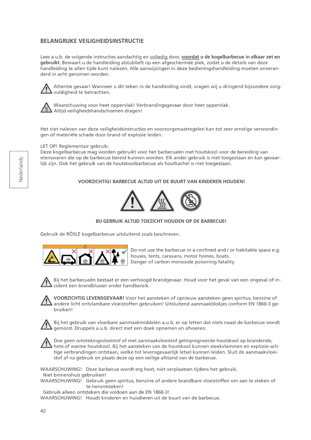 Plaque de cuisson, ronde 40 cm42 Nederlands BELANGRIJKE VEILIGHEIDSINSTRUCTIE Lees a.u.b. de volgende instructies aandachtig en volledig door, voordat u de kogelbarbecue in elkaar zet en gebruikt. Bewaart u de handleiding alstublieft op een afgeschermde plek, zodat u de details van deze handleiding te allen tijde kunt nalezen. Alle aanwijzingen in deze bedieningshandleiding moeten onveran- derd in acht genomen worden. Attentie gevaar! Wanneer u dit teken in de handleiding vindt, vragen wij u dringend bijzondere zorg- vuldigheid te betrachten. Waarschuwing voor heet oppervlak! Verbrandingsgevaar door heet oppervlak. Altijd veiligheidshandschoenen dragen! Het niet naleven van deze veiligheidsinstructies en voorzorgsmaatregelen kan tot zeer ernstige verwondin- gen of materiële schade door brand of explosie leiden. LET OP! Reglementair gebruik: Deze kogelbarbecue mag worden gebruikt voor het barbecueën met houtskool voor de bereiding van etenswaren die op de barbecue bereid kunnen worden. Elk ander gebruik is niet toegestaan en kan gevaar- lijk zijn. Ook het gebruik van de houtskoolbarbecue als houtkachel is niet toegestaan. VOORZICHTIG! BARBECUE ALTIJD UIT DE BUURT VAN KINDEREN HOUDEN! BIJ GEBRUIK ALTIJD TOEZICHT HOUDEN OP DE BARBECUE! Gebruik de RÖSLE kogelbarbecue uitsluitend zoals beschreven. Do not use the barbecue in a conned and / or habitable space e.g. houses, tents, caravans, motor homes, boats. Danger of carbon monoxide poisoning fatality. Bij het barbecueën bestaat er een verhoogd brandgevaar. Houd voor het geval van een ongeval of in- cident een brandblusser onder handbereik. VOORZICHTIG LEVENSGEVAAR! Voor het aansteken of opnieuw aansteken geen spiritus, benzine of andere licht ontvlambare vloeistoffen gebruiken! Uitsluitend aanmaakblokjes conform EN 1860-3 ge- bruiken! Bij het gebruik van vloeibare aanmaakmiddelen a.u.b. er op letten dat niets naast de barbecue wordt gemorst. Druppels a.u.b. direct met een doek opnemen en afvoeren. Doe geen ontstekingsvloeistof of met aanmaakvloeistof geïmpregneerde houtskool op brandende, hete of warme houtskool. Bij het aansteken van de houtskool kunnen steekvlammen en explosie-ach- tige verbrandingen ontstaan, welke tot levensgevaarlijk letsel kunnen leiden. Sluit de aanmaakvloei- stof af na gebruik en plaats deze op een veilige afstand van de barbecue. WAARSCHUWING! Deze barbecue wordt erg heet, niet verplaatsen tijdens het gebruik. Niet binnenshuis gebruiken! WAARSCHUWING! Gebruik geen spiritus, benzine of andere brandbare vloeistoffen om aan te steken of te herontsteken! Gebruik alleen ontstekers die voldoen aan de EN 1860-3! WAARSCHUWING! Houdt kinderen en huisdieren uit de buurt van de barbecue.43 Nederlands LET OP! Kinderen en huisdieren mogen zich nooit zonder toezicht in de buurt van een hete barbecue bevinden. LET OP! Deze kogelbarbecue wordt zeer heet en mag tijdens bedrijf niet bewogen worden. Overige belangrijke gevareninstructies Niet in gesloten ruimten gebruiken, anders verzamelen er zich giftige dampen, welke tot ernstig