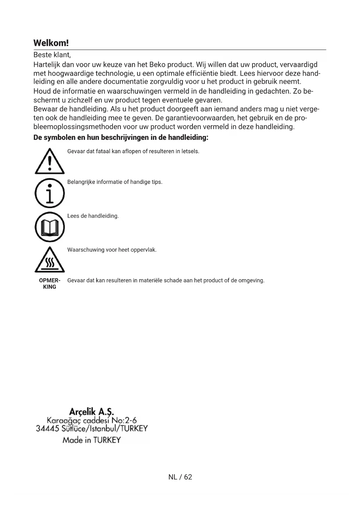 NLNL / 62 Welkom! Beste klant, Hartelijk dan voor uw keuze van het Beko product. Wij willen dat uw product, vervaardigd met hoogwaardige technologie, u een optimale efficiëntie biedt. Lees hiervoor deze hand- leiding en alle andere documentatie zorgvuldig voor u het product in gebruik neemt. Houd de informatie en waarschuwingen vermeld in de handleiding in gedachten. Zo be- schermt u zichzelf en uw product tegen eventuele gevaren. Bewaar de handleiding. Als u het product doorgeeft aan iemand anders mag u niet verge- ten ook de handleiding mee te geven. De garantievoorwaarden, het gebruik en de pro- bleemoplossingsmethoden voor uw product worden vermeld in deze handleiding. De symbolen en hun beschrijvingen in de handleiding: Gevaar dat fataal kan aflopen of resulteren in letsels. Belangrijke informatie of handige tips. Lees de handleiding. Waarschuwing voor heet oppervlak. OPMER- KING Gevaar dat kan resulteren in materiële schade aan het product of de omgeving.NL / 63 Inhoudsopgave 1 Veiligheidsinstructies ................... 64