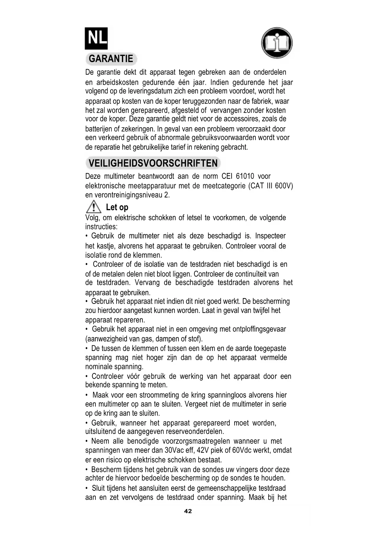 Sehr geehrter Kunde, Wenn Sie diesen Artikel irgendwann entsorgen wollen, denken Sie bitte daran, dass viele seiner Bauteile aus Wertstoffen bestehen, die wiederverwendet werden können. Bitte entsorgen Sie ihn nicht in die Mülltonne, sondern erkundigen Sie sich bei Ihrer örtlichen Behörde nach Entsorgungseinrichtungen an Ihrem Wohnort.42 GARANTIE De garantie dekt dit apparaat tegen gebreken aan de onderdelen en arbeidskosten gedurende één jaar. Indien gedurende het jaar volgend op de leveringsdatum zich een probleem voordoet, wordt het apparaat op kosten van de koper teruggezonden naar de fabriek, waar het zal worden gerepareerd, afgesteld of vervangen zonder kosten voor de koper. Deze garantie geldt niet voor de accessoires, zoals de batterijen of zekeringen. In geval van een probleem veroorzaakt door een verkeerd gebruik of abnormale gebruiksvoorwaarden wordt voor de reparatie het gebruikelijke tarief in rekening gebracht. VEILIGHEIDSVOORSCHRIFTEN Deze multimeter beantwoordt aan de norm CEI 61010 voor elektronische meetapparatuur met de meetcategorie (CAT III 600V) en verontreinigingsniveau 2. Let op Volg, om elektrische schokken of letsel te voorkomen, de volgende instructies: