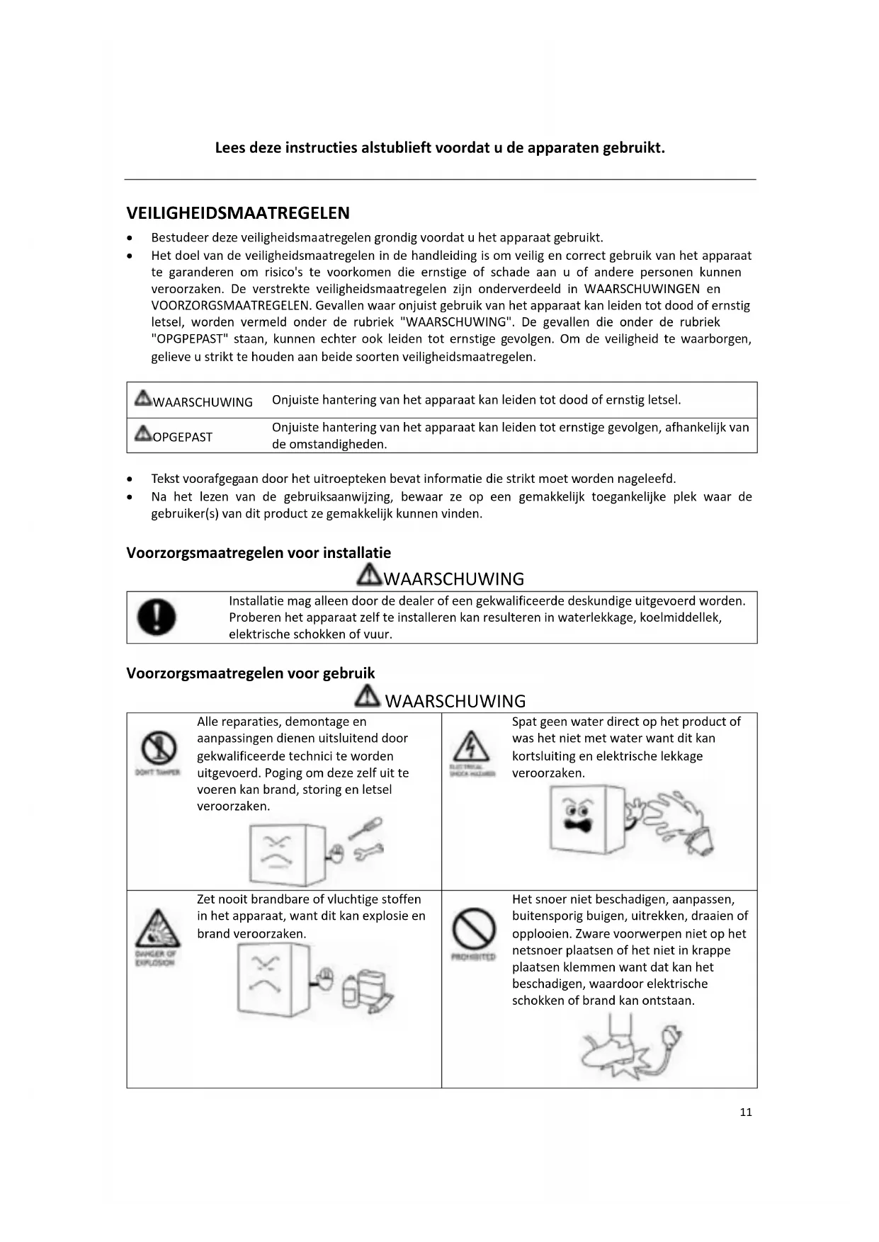 Tekst voorafgegaan door het uitroepteken bevat informatie die strikt moet worden nageleefd. Na het lezen van de gebruiksaanwijzing, bewaar ze op een gemakkelijk toegankelijke plek waar de gebruiker(s) van dit product ze gemakkelijk kunnen vinden. Voorzorgsmaatregelen voor installatie WAARSCHUWING
