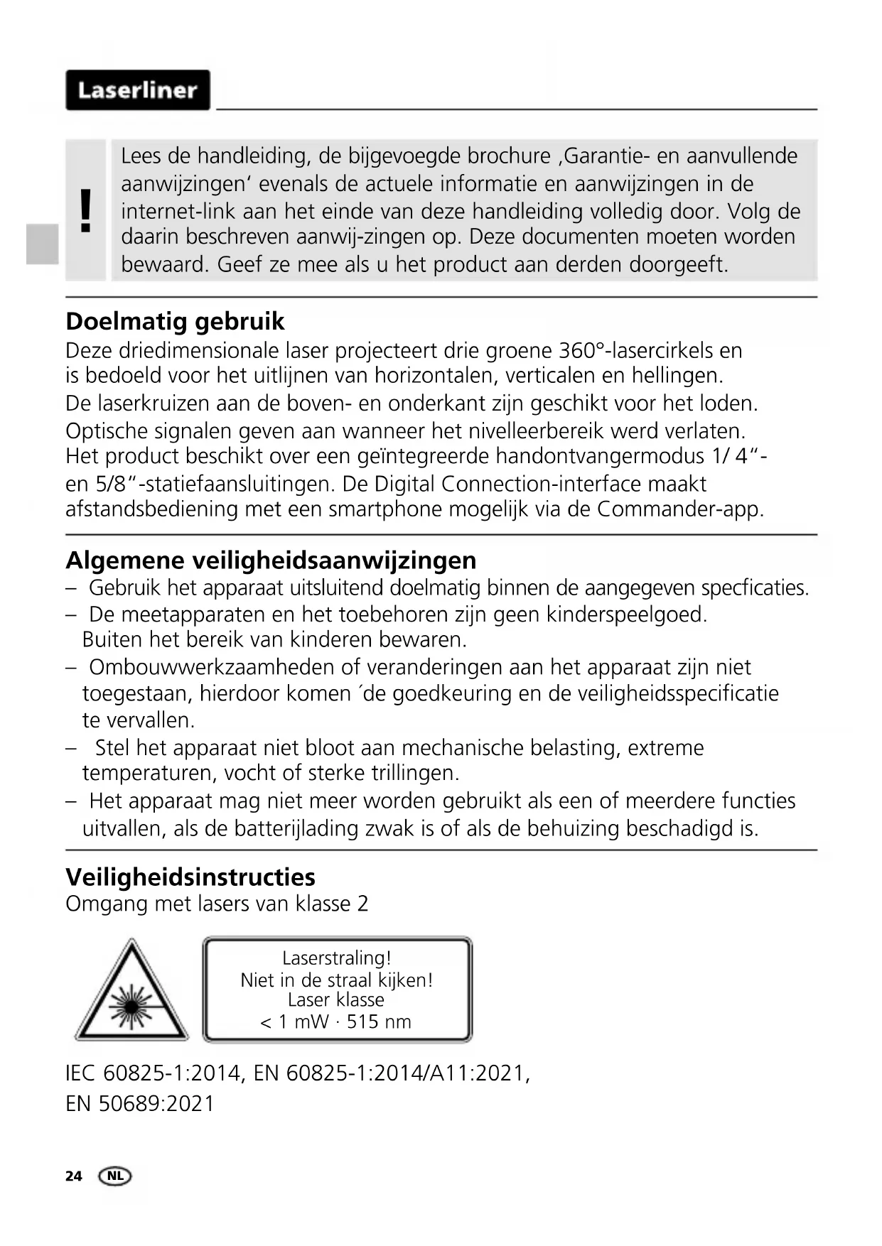 Doelmatig gebruik Deze driedimensionale laser projecteert drie groene 360°-lasercirkels en is bedoeld voor het uitlijnen van horizontalen, verticalen en hellingen. De laserkruizen aan de boven- en onderkant zijn geschikt voor het loden. Optische signalen geven aan wanneer het nivelleerbereik werd verlaten. Het product beschikt over een geïntegreerde handontvangermodus 1/ 4“- en 5/8“-statiefaansluitingen. De Digital Connection-interface maakt afstandsbediening met een smartphone mogelijk via de Commander-app. Algemene veiligheidsaanwijzingen – Gebruik het apparaat uitsluitend doelmatig binnen de aangegeven speccaties. – De meetapparaten en het toebehoren zijn geen kinderspeelgoed. Buiten het bereik van kinderen bewaren. – Ombouwwerkzaamheden of veranderingen aan het apparaat zijn niet toegestaan, hierdoor komen ´de goedkeuring en de veiligheidsspecicatie te vervallen. – Stel het apparaat niet bloot aan mechanische belasting, extreme temperaturen, vocht of sterke trillingen. – Het apparaat mag niet meer worden gebruikt als een of meerdere functies uitvallen, als de batterijlading zwak is of als de behuizing beschadigd is. Veiligheidsinstructies Omgang met lasers van klasse 2