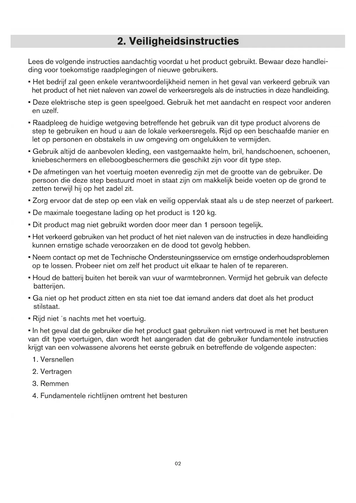 - Raadpleeg de huidige wetgeving betreffende het gebruik van dit type product alvorens de step te gebruiken en houd u aan de lokale verkeersregels. Rijd op een beschaafde manier en let op personen en obstakels in uw omgeving om ongelukken te vermijden.