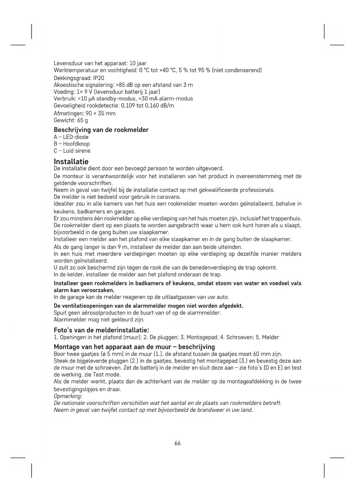 SCHEMA 1 MINIMUM 50 cm MINIMUMMAXIMUM 10 cm 30,5 cm INBEDRIJFSTELLING Plaats de batterij (1× 9 V) in het batterijvak aan de achterkant van het apparaat. Gebruik alleen een alkalinebatterij, gebruik nooit een oplaadbare batterij. Let bij het plaatsen van de batterij in het vakje met de plastic lipjes op de plaatsingswijze en de juiste polariteit van de batterij! Zie fig. D en E: Plaatsingwijze van de batterij. De batterij moet volledig in het batterijvak zijn geplaatst, anders kan het montagepad niet worden aangebracht! Een metalen lipje in het batterijvak verhindert het plaatsen van het montagepad als de batterij niet of niet juist/onvolledig is geplaatst. Na het plaatsen van de batterij moet een test worden uitgevoerd met de hoofdknop. Druk lang op de hoofdknop, er moet 3 keer een korte pieptoon klinken met een pauze van 1,5 seconde, terwijl u de knop ingedrukt houdt. Dat betekent dat de melder werkt. De bedrijfsstatus van de melder wordt aangegeven door: 1× LED flits om de 32 seconden. Als er geen pieptoon klinkt wanneer de testknop wordt ingedrukt, gaat het waarschijnlijk om een storing en moet u contact opnemen met de service of is de batterij leeg. TESTMODUS Indien nodig of telkens wanneer u de batterijen vervangt, kunt u de werking van de melder controleren. Druk ongeveer 5 seconden op de hoofdknop, de melder piept 3 keer achter elkaar (gevolgd door een pauze van 1,5 seconde) en de rode LED knippert. Als de melder niet piept, controleer dan de batterij en de plaatsingswijze. Voer de 1× per week uit om te controleren of het alarm werkt. Opmerking: De akoestische en optische signalen tijdens het testen worden alleen gebruikt om aan te geven dat de melder werkt. Het betekent niet dat er rook is waargenomen. FOUTSTATUS Als de melder zich in een foutstatus bevindt, werkt hij niet. De foutstatus van de melder wordt om de 32 seconden aangegeven door: 1× LED flits – 1× piep – 1× LED flits. Vervang onmiddellijk de batterij en controleer de melder op beschadigingen, maak de openingen van de melder schoon, b.v. met een stofzuiger. Voer een functietest uit.68 Als de foutstatus ook na het vervangen van de batterij gemeld blijft worden, neem dan contact op met het servicecentrum. LEGE BATTERIJ Als de batterij bijna leeg is, wordt dit aangegeven door een gelijktijdige 1× pieptoon/1× knippering van de rode LED om de 32 seconden gedurende ten minste 30 dagen totdat de batterij helemaal leeg is. Vervang de batterij onmiddellijk.Gebruik alleen alkaline batterijen, geen oplaadbare batterijen. Voer een functietest uit. Uit voorzorg wordt aanbevolen de batterij 1× per jaar te vervangen.