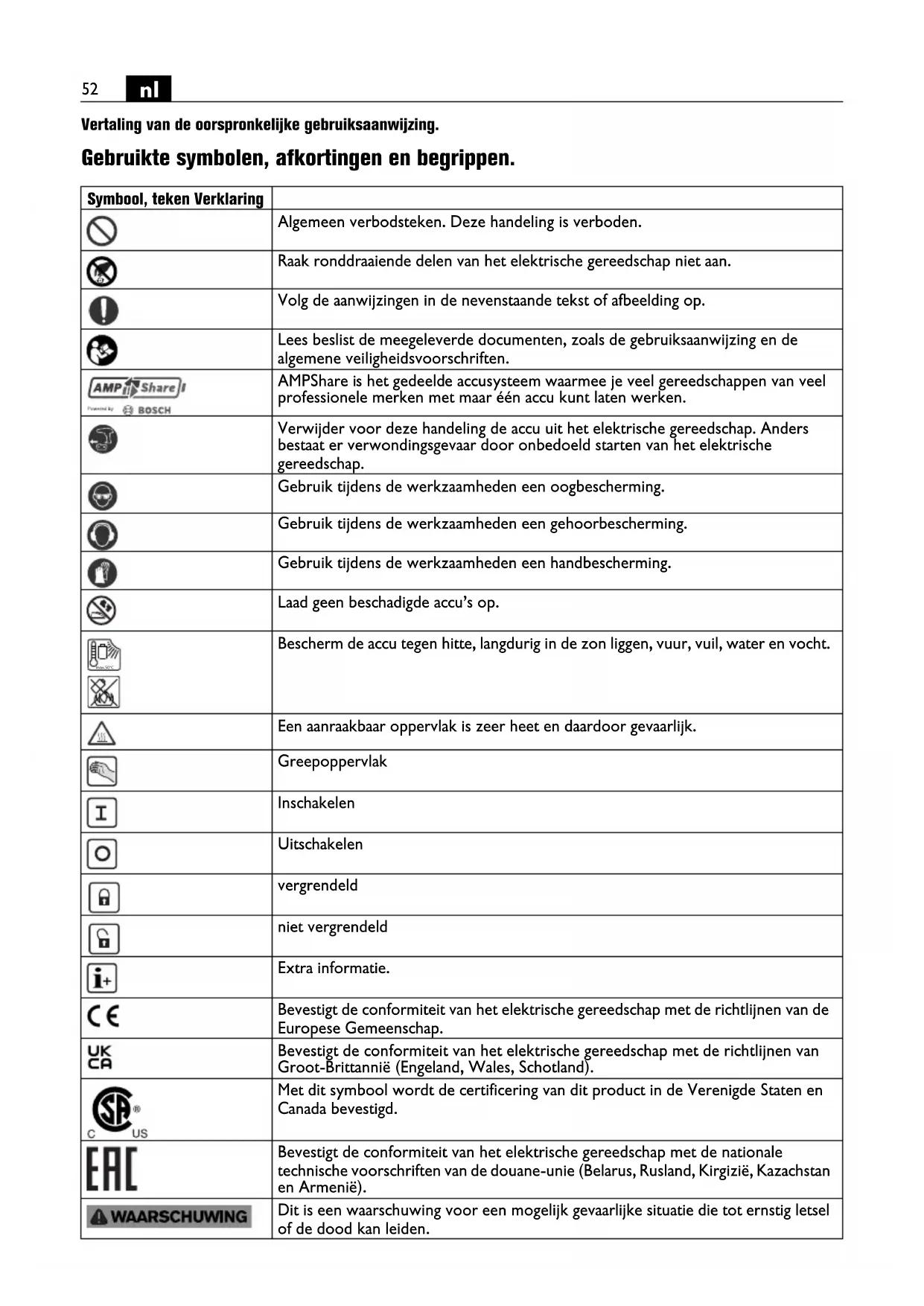 Vertaling van de oorspronkelijke gebruiksaanwijzing. Gebruikte symbolen, afkortingen en begrippen. Symbool, teken Verklaring Algemeen verbodsteken. Deze handeling is verboden. Raak ronddraaiende delen van het elektrische gereedschap niet aan. Volg de aanwijzingen in de nevenstaande tekst of afbeelding op. Lees beslist de meegeleverde documenten, zoals de gebruiksaanwijzing en de algemene veiligheidsvoorschriften. AMPShare is het gedeelde accusysteem waarmee je veel gereedschappen van veel professionele merken met maar één accu kunt laten werken. Verwijder voor deze handeling de accu uit het elektrische gereedschap. Anders bestaat er verwondingsgevaar door onbedoeld starten van het elektrische gereedschap. Gebruik tijdens de werkzaamheden een oogbescherming. Gebruik tijdens de werkzaamheden een gehoorbescherming. Gebruik tijdens de werkzaamheden een handbescherming. Laad geen beschadigde accu’s op. Bescherm de accu tegen hitte, langdurig in de zon liggen, vuur, vuil, water en vocht. Een aanraakbaar oppervlak is zeer heet en daardoor gevaarlijk. Greepoppervlak Inschakelen Uitschakelen vergrendeld niet vergrendeld Extra informatie. Bevestigt de conformiteit van het elektrische gereedschap met de richtlijnen van de Europese Gemeenschap. Bevestigt de conformiteit van het elektrische gereedschap met de richtlijnen van Groot-Brittannië (Engeland, Wales, Schotland). Met dit symbool wordt de certificering van dit product in de Verenigde Staten en Canada bevestigd. Bevestigt de conformiteit van het elektrische gereedschap met de nationale technische voorschriften van de douane-unie (Belarus, Rusland, Kirgizië, Kazachstan en Armenië). Dit is een waarschuwing voor een mogelijk gevaarlijke situatie die tot ernstig letsel of de dood kan leiden. max.50°C53