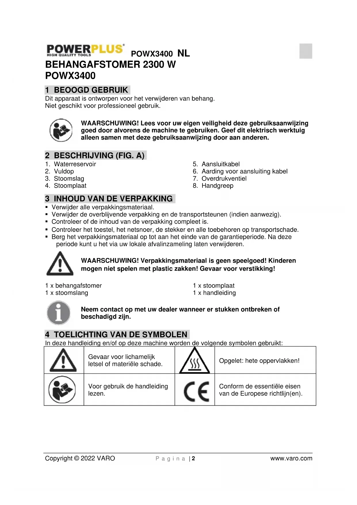 - Om de optimale prestaties van het apparaat te waarborgen, vooral in gebieden met hard water, kan het nodig zijn om het verwarmingselement te ontkalken. Gebruik hiervoor producten die specifiek voor waterkokers bestemd zijn – volg altijd nauwkeurig de instructies van de fabrikant op. 10 TECHNISCHE GEGEVENS Model Nr. POWX3400 Nominale spanning 220-240 V Frequentie 50 Hz Nominaal vermogen 1900 – 2300 W Tankinhoud 4,5 l Slanglengte 3 m Slang diameter 24 mm Afmetingen stoomplaat 280 x 200 mm Werkduur 70 minPOWX3400 NL Copyright © 2022 VARO P a g i n a | 7 www.varo.com 11 GARANTIE
