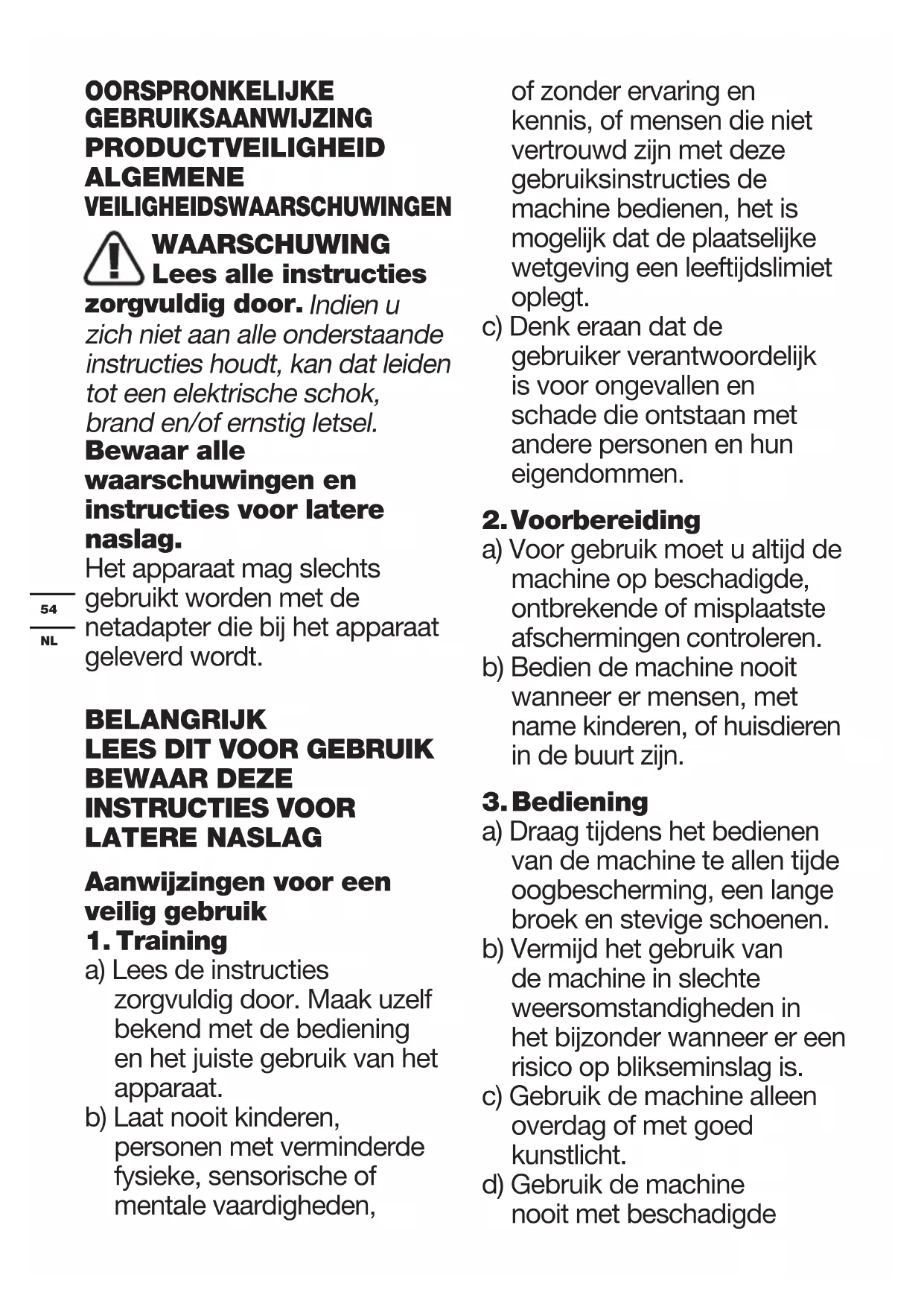 a) Lees de instructies zorgvuldig door. Maak uzelf bekend met de bediening en het juiste gebruik van het apparaat. b) Laat nooit kinderen, personen met verminderde fysieke, sensorische of mentale vaardigheden, of zonder ervaring en kennis, of mensen die niet vertrouwd zijn met deze gebruiksinstructies de machine bedienen, het is mogelijk dat de plaatselijke wetgeving een leeftijdslimiet oplegt. c) Denk eraan dat de gebruiker verantwoordelijk is voor ongevallen en schade die ontstaan met andere personen en hun eigendommen.