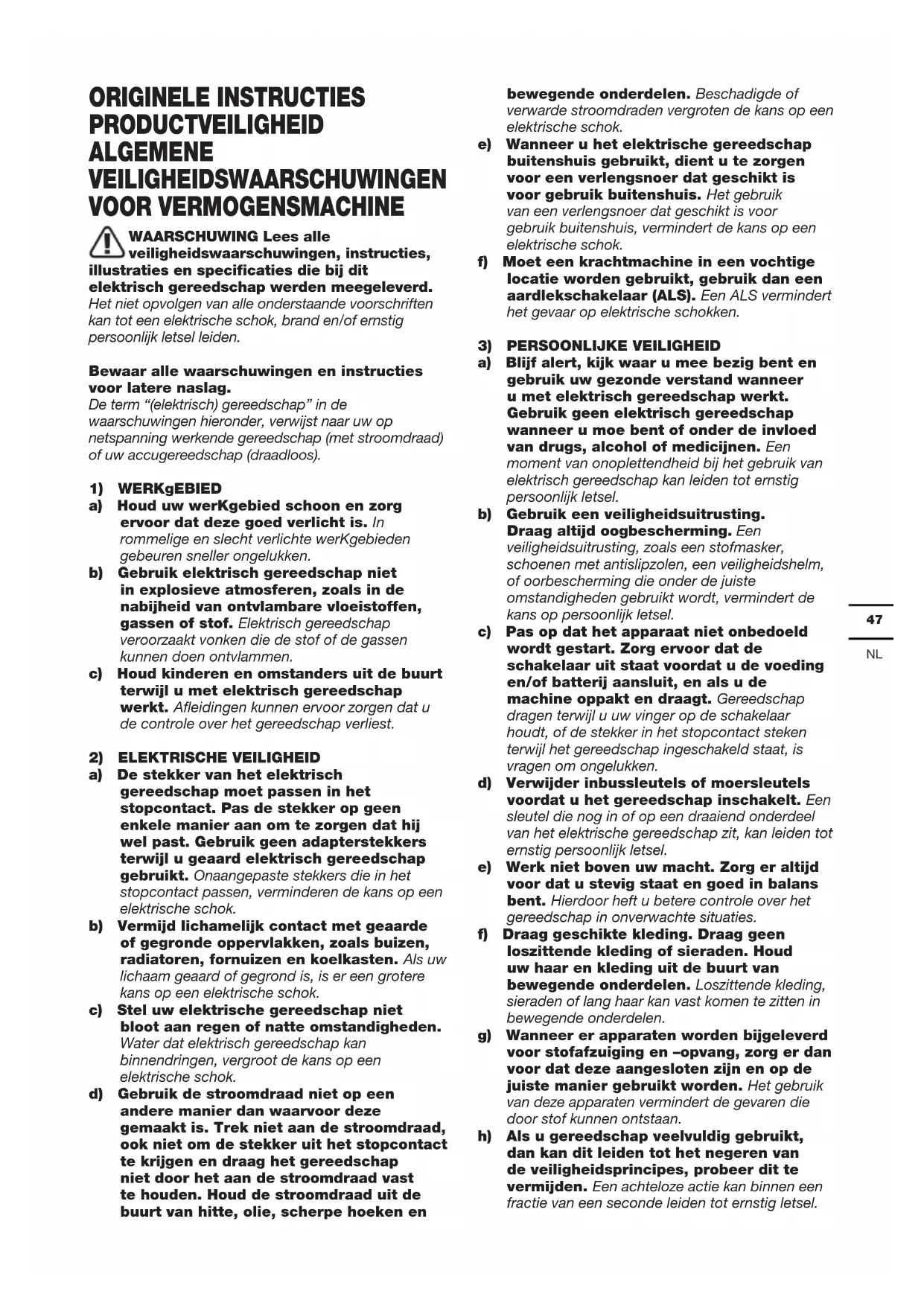 ORIGINELE INSTRUCTIES PRODUCTVEILIGHEID ALGEMENE VEILIGHEIDSWAARSCHUWINGEN VOOR VERMOGENSMACHINE WAARSCHUWING Lees alle veiligheidswaarschuwingen, instructies, illustraties en specificaties die bij dit elektrisch gereedschap werden meegeleverd. Het niet opvolgen van alle onderstaande voorschriften kan tot een elektrische schok, brand en/of ernstig persoonlijk letsel leiden. Bewaar alle waarschuwingen en instructies voor latere naslag. De term “(elektrisch) gereedschap” in de waarschuwingen hieronder, verwijst naar uw op netspanning werkende gereedschap (met stroomdraad) of uw accugereedschap (draadloos).