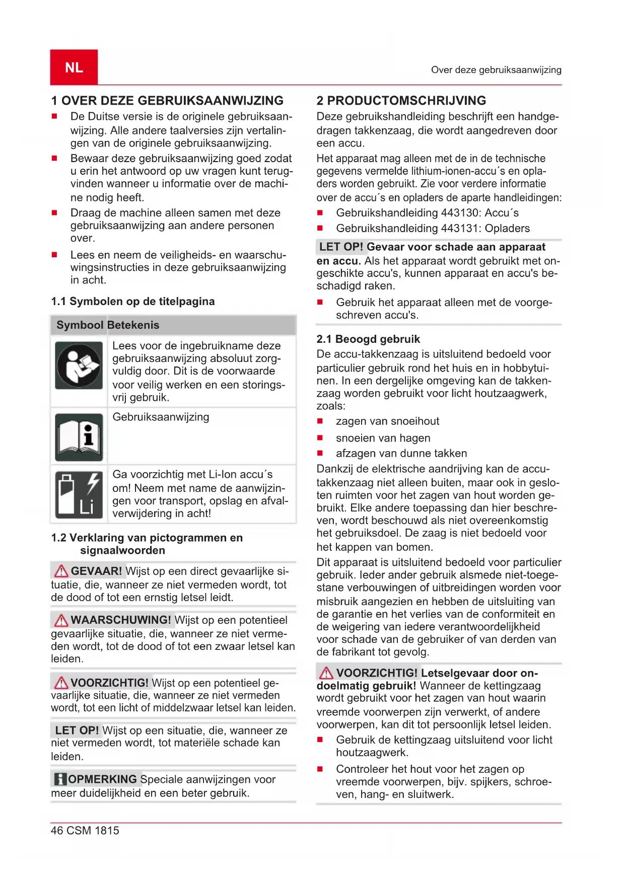signaalwoorden GEVAAR! Wijst op een direct gevaarlijke si- tuatie, die, wanneer ze niet vermeden wordt, tot de dood of tot een ernstig letsel leidt. WAARSCHUWING! Wijst op een potentieel gevaarlijke situatie, die, wanneer ze niet verme- den wordt, tot de dood of tot een zwaar letsel kan leiden. VOORZICHTIG! Wijst op een potentieel ge- vaarlijke situatie, die, wanneer ze niet vermeden wordt, tot een licht of middelzwaar letsel kan leiden. LET OP! Wijst op een situatie, die, wanneer ze niet vermeden wordt, tot materiële schade kan leiden. OPMERKING Speciale aanwijzingen voor meer duidelijkheid en een beter gebruik. 2 PRODUCTOMSCHRIJVING Deze gebruikshandleiding beschrijft een handge- dragen takkenzaag, die wordt aangedreven door een accu. Het apparaat mag alleen met de in de technische gegevens vermelde lithium-ionen-accu´s en opla- ders worden gebruikt. Zie voor verdere informatie over de accu´s en opladers de aparte handleidingen: