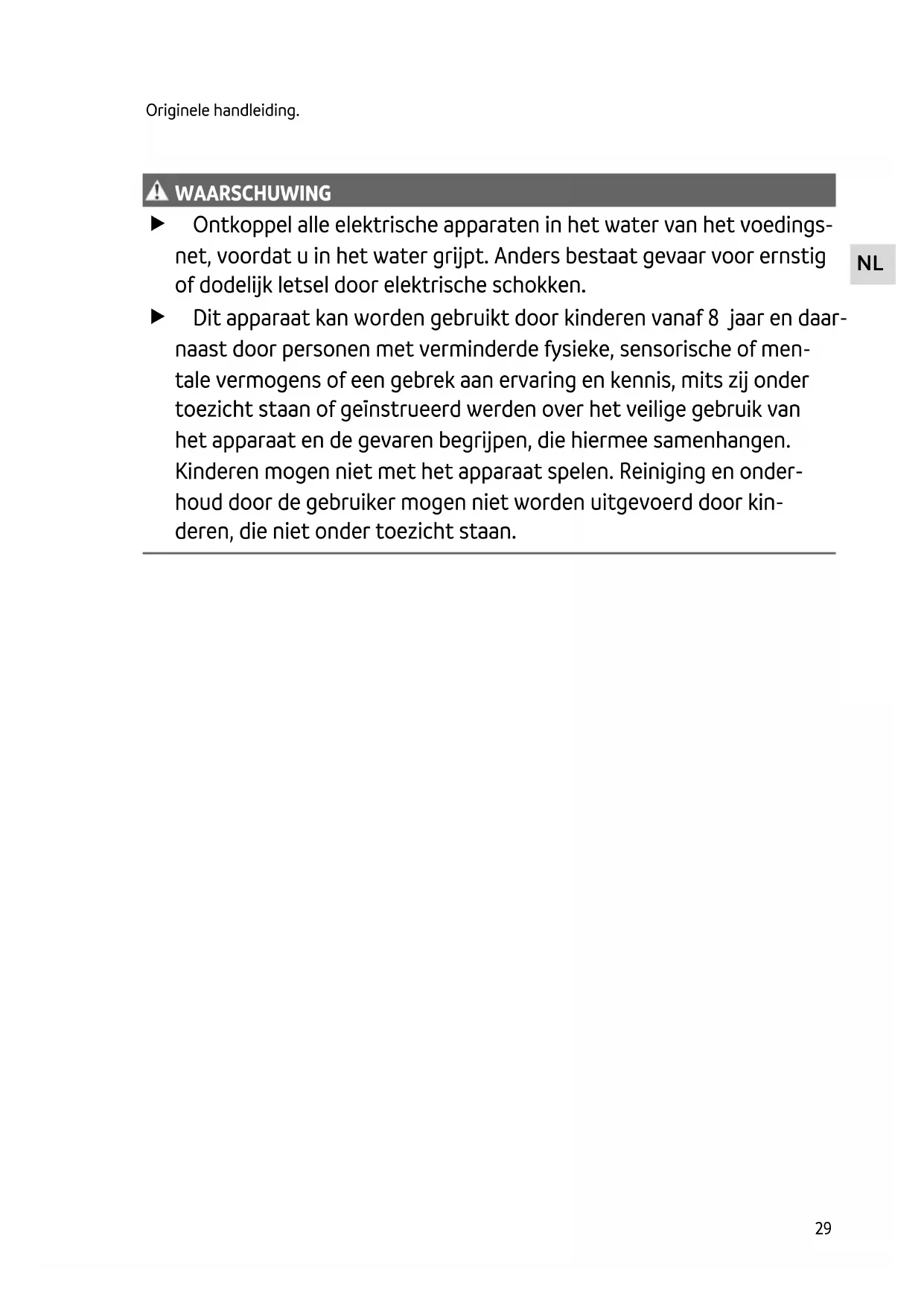 WAARSCHUWING WAARSCHUWING Ontkoppel alle elektrische apparaten in het water van het voedings- net, voordat u in het water grijpt. Anders bestaat gevaar voor ernstig of dodelijk letsel door elektrische schokken. Dit apparaat kan worden gebruikt door kinderen vanaf 8 jaar en daar- naast door personen met verminderde fysieke, sensorische of men- tale vermogens of een gebrek aan ervaring en kennis, mits zij onder toezicht staan of geïnstrueerd werden over het veilige gebruik van het apparaat en de gevaren begrijpen, die hiermee samenhangen. Kinderen mogen niet met het apparaat spelen. Reiniging en onder- houd door de gebruiker mogen niet worden uitgevoerd door kin- deren, die niet onder toezicht staan.30 Veiligheidsinstructies Elektrische aansluiting Sluit het apparaat alleen aan, wanneer de elektrische gegevens van het apparaat en de voeding overeenkomen. Gebruik het apparaat uitsluitend op een volgens de voorschriften geïnstalleerde contactdoos. Het apparaat moet beveiligd zijn via een aardlekschakelaar met een vastgestelde lekstroom van maximaal 30 mA. Verlengkabels en stroomverdelers (bijv. stekkerdelen) moeten voor het gebruik buitenshuis geschikt zijn (spatwaterbestendig). Bescherm open stekkers en stopcontacten tegen vocht. Veilig gebruik Gebruik het apparaat uitsluitend, als er zich geen personen in het water bevinden. Gebruik het apparaat niet als elektrische snoeren of behuizing beschadigd zijn. Een beschadigde netaansluitkabel direct door OASE, een geautoriseerde servicedienst of een gekwalificeerde elektrotechnicus laten vervangen om gevaar door elektrocutie te vermijden. Het apparaat niet aan de elektrische leiding dragen of aan de leiding trekken. Installeer de leidingen zodanig, dat deze tegen beschadigingen zijn beschermd en niemand er- over kan struikelen. Breng nooit technische veranderingen aan het apparaat aan. Voer uitsluitend die werkzaamheden aan het apparaat uit die in deze gebruiksaanwijzing zijn beschreven. Gebruik uitsluitend originele reserveonderdelen en origineel toebehoren. Neem bij problemen contact op met de geautoriseerde klantenservice of met OASE. Beoogd gebruik Gebruik het in deze gebruiksaanwijzing beschreven product uitsluitend op de volgende manier: Transporteren van schoon water of regenwater. Transporteren van gechloreerd water. Transporteren van vuil water met deeltjes tot maximaal 40 mm grootte. Irrigeren en besproeien. Ompompen en leegpompen van reservoirs of bassins. Waterafname uit regentonnen of stortbakken. Met in achtneming van deze technische gegevens. (→ Technische gegevens) De volgende inperkingen gelden voor het apparaat: Niet geschikt voor zoutwater. Niet geschikt voor drinkwater. Niet toepassen voor continu bedrijf (bijvoorbeeld continu circuleren in een vijver). Niet gebruiken voor industriële doeleinden. Niet gebruiken in combinatie met chemicaliën, levensmiddelen, licht brandbare of explosieve stoffen. Niet aansluiten op de drinkwatervoorziening.NL