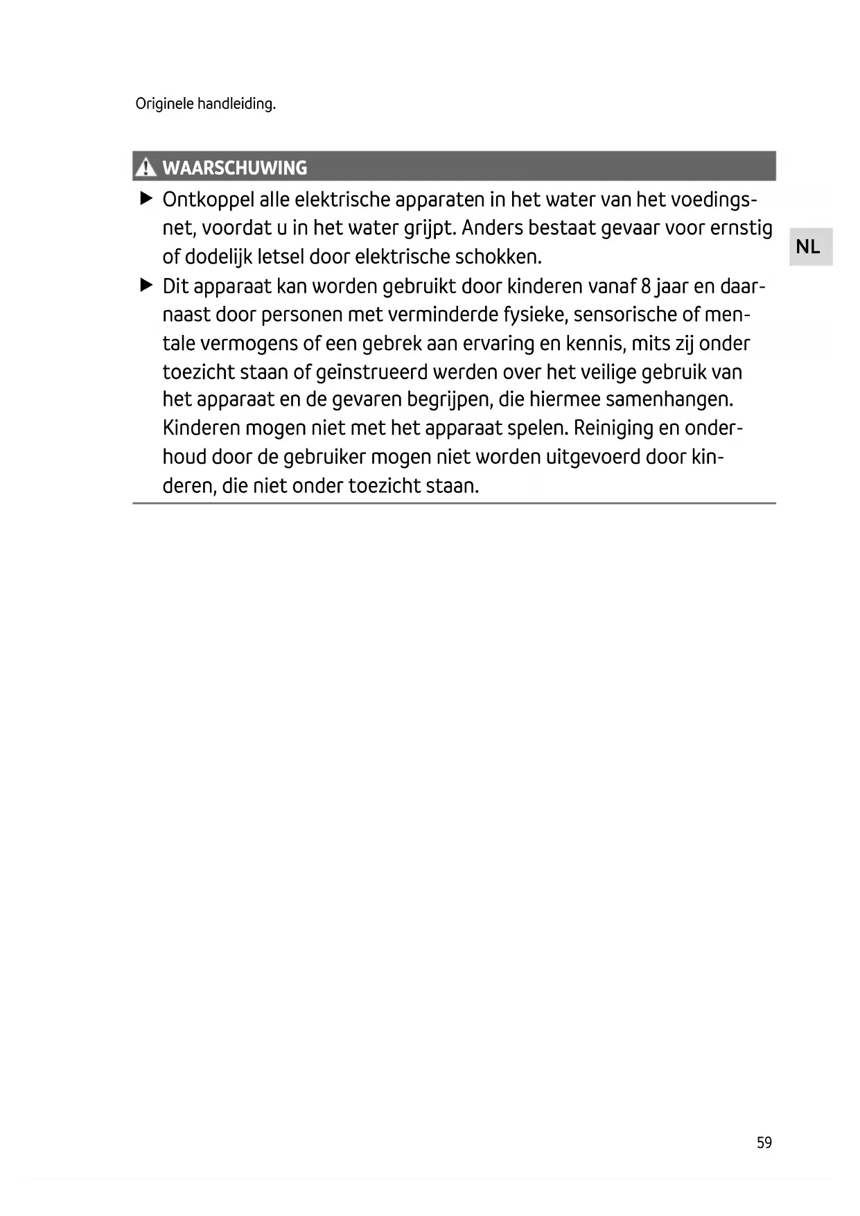 WAARSCHUWING WAARSCHUWING Ontkoppel alle elektrische apparaten in het water van het voedings- net, voordat u in het water grijpt. Anders bestaat gevaar voor ernstig of dodelijk letsel door elektrische schokken. Dit apparaat kan worden gebruikt door kinderen vanaf 8 jaar en daar- naast door personen met verminderde fysieke, sensorische of men- tale vermogens of een gebrek aan ervaring en kennis, mits zij onder toezicht staan of geïnstrueerd werden over het veilige gebruik van het apparaat en de gevaren begrijpen, die hiermee samenhangen. Kinderen mogen niet met het apparaat spelen. Reiniging en onder- houd door de gebruiker mogen niet worden uitgevoerd door kin- deren, die niet onder toezicht staan.60 Veiligheidsinstructies Elektrische aansluiting