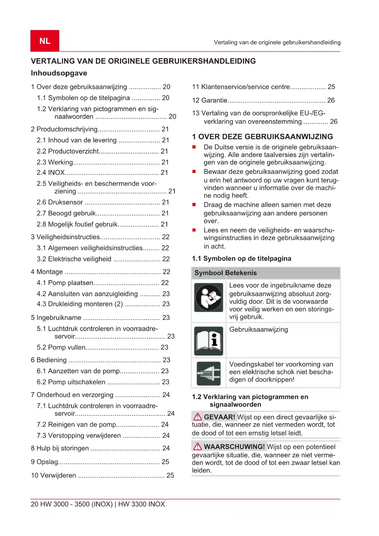 signaalwoorden GEVAAR! Wijst op een direct gevaarlijke si- tuatie, die, wanneer ze niet vermeden wordt, tot de dood of tot een ernstig letsel leidt. WAARSCHUWING! Wijst op een potentieel gevaarlijke situatie, die, wanneer ze niet verme- den wordt, tot de dood of tot een zwaar letsel kan leiden.477032_h 21 Productomschrijving VOORZICHTIG! Wijst op een potentieel ge- vaarlijke situatie, die, wanneer ze niet vermeden wordt, tot een licht of middelzwaar letsel kan leiden. LET OP! Wijst op een situatie, die, wanneer ze niet vermeden wordt, tot materiële schade kan leiden. OPMERKING Speciale aanwijzingen voor meer duidelijkheid en een beter gebruik. 2 PRODUCTOMSCHRIJVING In deze gebruikershandleiding worden verschil- lende pompmodellen beschreven. U kunt uw mo- del identificeren aan de hand van het typeplaatje.