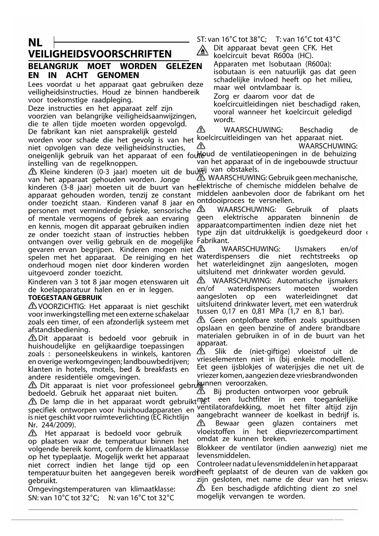 Lees voordat u het apparaat gaat gebruiken deze veiligheidsinstructies. Houd ze binnen handbereik voor toekomstige raadpleging. Deze instructies en het apparaat zelf zijn voorzien van belangrijke veiligheidsaanwijzingen, die te allen tijde moeten worden opgevolgd. De fabrikant kan niet aansprakelijk gesteld worden voor schade die het gevolg is van het niet opvolgen van deze veiligheidsinstructies, oneigenlijk gebruik van het apparaat of een foute instelling van de regelknoppen. Kleine kinderen (0-3 jaar) moeten uit de buurt van het apparaat gehouden worden. Jonge kinderen (3-8 jaar) moeten uit de buurt van het apparaat gehouden worden, tenzij ze constant onder toezicht staan. Kinderen vanaf 8 jaar en personen met verminderde fysieke, sensorische of mentale vermogens of gebrek aan ervaring en kennis, mogen dit apparaat gebruiken indien ze onder toezicht staan of instructies hebben ontvangen over veilig gebruik en de mogelijke gevaren ervan begrijpen. Kinderen mogen niet spelen met het apparaat. De reiniging en het onderhoud mogen niet door kinderen worden uitgevoerd zonder toezicht. Kinderen van 3 tot 8 jaar mogen etenswaren uit de koelapparatuur halen en er in leggen. TOEGESTAAN GEBRUIK VOORZICHTIG: Het apparaat is niet geschikt voor inwerkingstelling met een externe schakelaar zoals een timer, of een afzonderlijk systeem met afstandsbediening. Dit apparaat is bedoeld voor gebruik in huishoudelijke en gelijkaardige toepassingen zoals : personeelskeukens in winkels, kantoren en overige werkomgevingen; landbouwbedrijven; klanten in hotels, motels, bed & breakfasts en andere residentiële omgevingen. Dit apparaat is niet voor professioneel gebruik bedoeld. Gebruik het apparaat niet buiten. De lamp die in het apparaat wordt gebruikt is specifiek ontworpen voor huishoudapparaten en is niet geschikt voor ruimteverlichting (EC Richtlijn Nr. 244/2009). Het apparaat is bedoeld voor gebruik op plaatsen waar de temperatuur binnen het volgende bereik komt, conform de klimaatklasse op het typeplaatje. Mogelijk werkt het apparaat niet correct indien het lange tijd op een temperatuur buiten het aangegeven bereik wordt gebruikt. Omgevingstemperaturen van klimaatklasse: SN: van 10°C tot 32°C; N: van 16°C tot 32°C ST: van 16°C tot 38°C; T: van 16°C tot 43°C Dit apparaat bevat geen CFK. Het koelcircuit bevat R600a (HC). Apparaten met Isobutaan (R600a): isobutaan is een natuurlijk gas dat geen schadelijke invloed heeft op het milieu, maar wel ontvlambaar is. Zorg er daarom voor dat de koelcircuitleidingen niet beschadigd raken, vooral wanneer het koelcircuit geledigd wordt. WAARSCHUWING: Beschadig de koelcircuitleidingen van het apparaat niet. WAARSCHUWING: Houd de ventilatieopeningen in de behuizing van het apparaat of in de ingebouwde structuur vrij van obstakels. WAARSCHUWING: Gebruik geen mechanische, elektrische of chemische middelen behalve de middelen aanbevolen door de fabrikant om het ontdooiproces te versnellen. WAARSCHUWING: Gebruik of plaats geen elektrische apparaten binnenin de apparaatcompartimenten indien deze niet het type zijn dat uitdrukkelijk is goedgekeurd door de Fabrikant. WAARSCHUWING: IJsmakers en/of waterdispensers die niet rechtstreeks op het waterleidingnet zijn aangesloten, mogen uitsluitend met drinkwater worden gevuld. WAARSCHUWING: Automatische ijsmakers en/of waterdispensers moeten worden aangesloten op een waterleidingnet dat uitsluitend drinkwater levert, met een waterdruk tussen 0,17 en 0,81 MPa (1,7 en 8,1 bar). Geen ontplofbare stoffen zoals spuitbussen opslaan en geen benzine of andere brandbare materialen gebruiken in of in de buurt van het apparaat. Slik de (niet-giftige) vloeistof uit de vrieselementen niet in (bij enkele modellen). Eet geen ijsblokjes of waterijsjes die net uit de vriezer komen, aangezien deze vriesbrandwonden kunnen veroorzaken. Bij producten ontworpen voor gebruik met een luchtfilter in een toegankelijke ventilatorafdekking, moet het filter altijd zijn aangebracht wanneer de koelkast in bedrijf is. Bewaar geen glazen containers met vloeistoffen in het diepvriezercompartiment omdat ze kunnen breken. Blokkeer de ventilator (indien aanwezig) niet met levensmiddelen. Controleernadatu levensmiddelen in hetapparaat heeft geplaatst of de deuren van de vakken goed zijn gesloten, met name de deur van het vriesvak. Een beschadigde afdichting dient zo snel mogelijk vervangen te worden.Gebruik het koelkastcompartiment uitsluitend voor het bewaren van vers voedsel en het diepvriezercompartiment uitsluitend voor het bewaren van bevroren voedsel, het invriezen van vers voedsel en het maken van ijsblokjes. Vermijd het bewaren van onverpakt voedsel in direct contact met interne oppervlakken van de koelkast- of diepvriezercompartimenten. Apparaten kunnen over speciale compartimenten beschikken (vak voor verse etenswaar, nul graden-vak,...). Indien niet anders gespecificeerd in de productbeschrijving, kunnen deze compartimenten verwijderd worden zonder dat hierdoor de prestaties veranderen. C-pentaan wordt gebruikt als blaasmiddel in het isolatieschuim en is een licht ontvlambaar gas. Rekening houdend met de temperatuursverschillen in de verschillende koelkastcompartimenten, kunnen etenswaren het beste als volgt worden bewaard:
